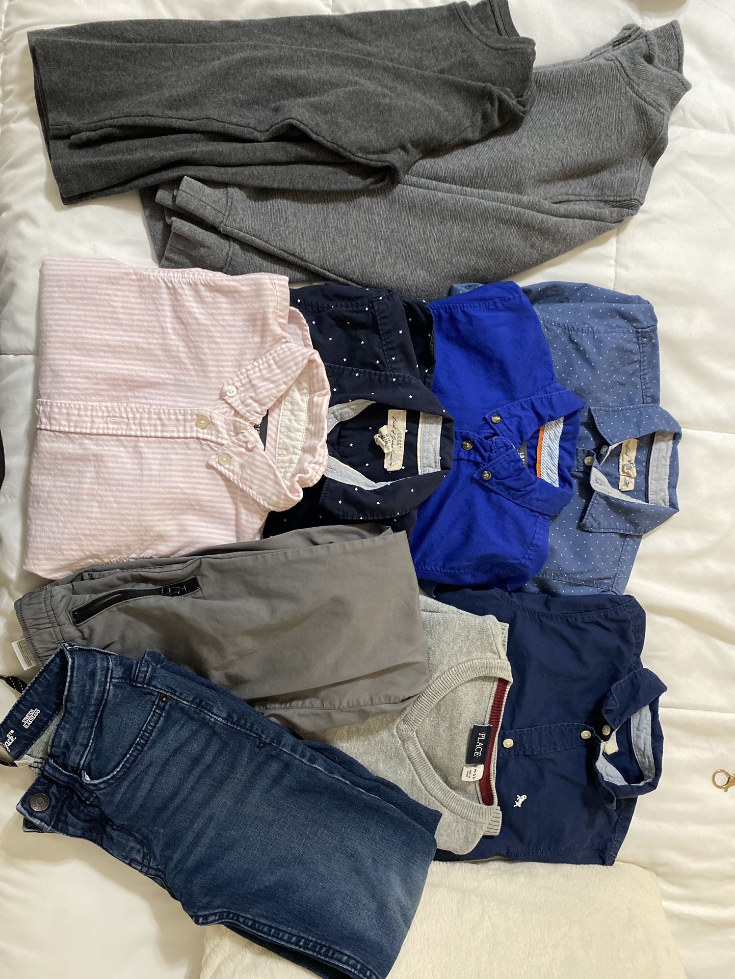 6 H& M button shirts long sleeve size 7-8 Gray long sleeve shirt size 8 Gray long sleeve pullover sweater zip top 7-8 Gray v neck Children’s place long sleeve sweater 7-8 Gray Old Navy Jogger pant (stretch size 8) Cat & Jack Jeans (stretch size 8)