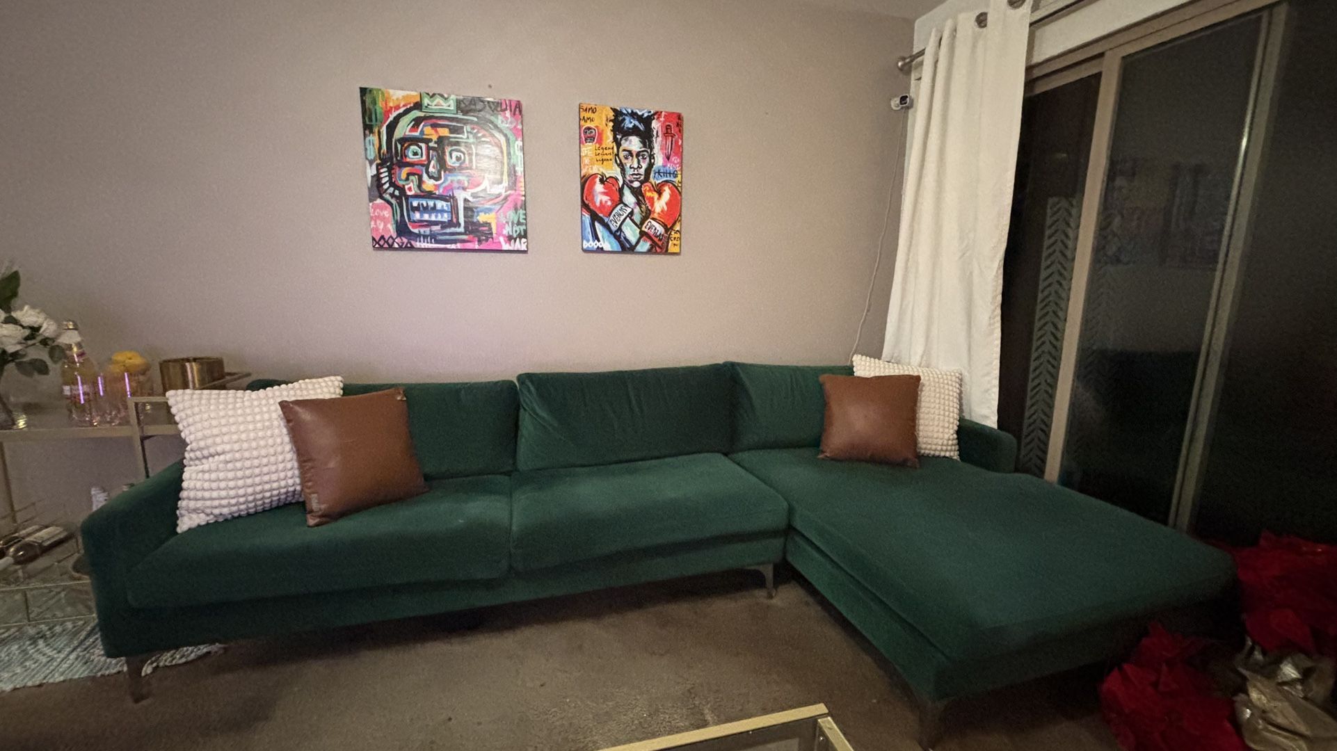 Pine green sofa with silver chrome legs. Length 116” Extended chase is 64”. Length off the ground is 6 1/2” is good conduction.