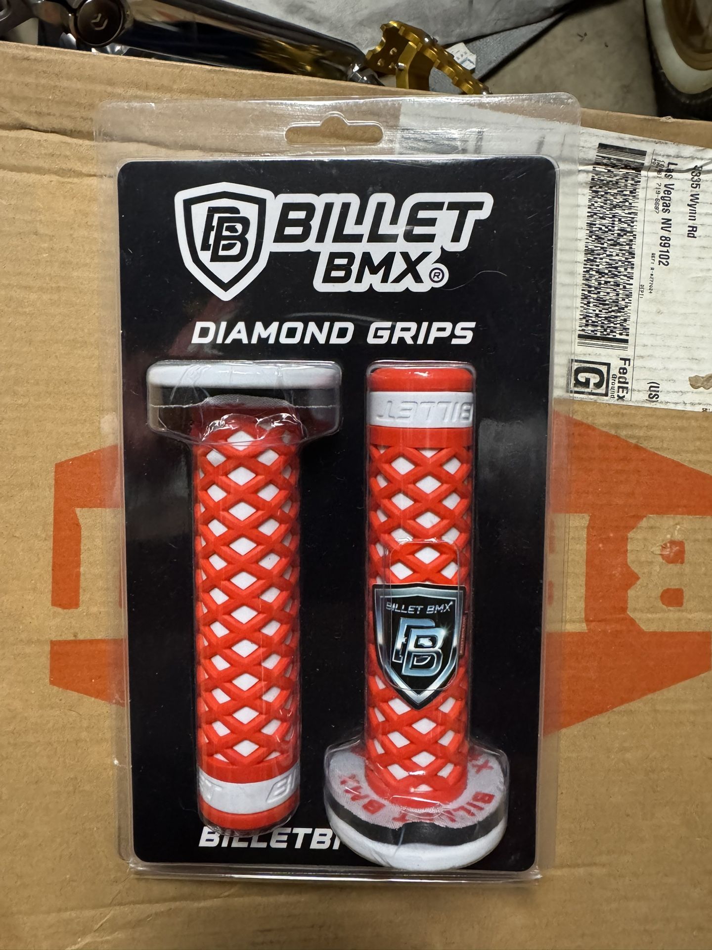 Selling a brand new pair of red Billet bike grips, red anodized bar, ends, and red anodized spray can valve caps. $115.00