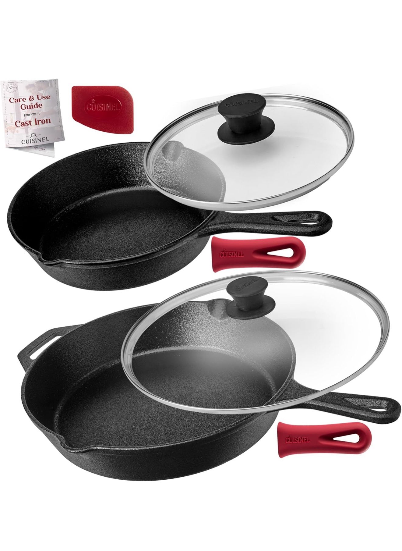 Never used, been sitting in cabinet as my original cast iron skillet is all I need. Received as a gift a couple years ago but don’t think I’ll ever need to use it. Cuisinel Cast Iron Skillet Set - 8" + 12"-Inch Frying Pan + Glass Lids - Pre-Seasoned Cookware - Heat-Resistant Holders - Indoor/Outdoor Use - Camping, Grill, Stove, BBQ, Firepit, Induction, Oven Safe