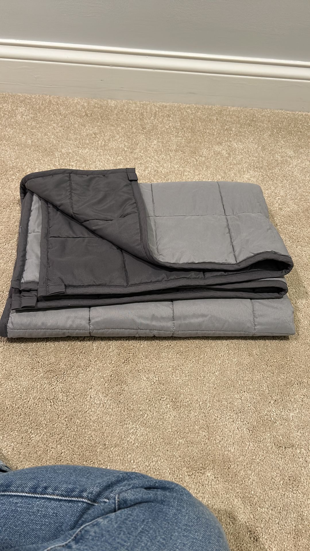 Dark gray/light gray weighted blanket. Weight: 3lbs. Size: 36in x 48in
