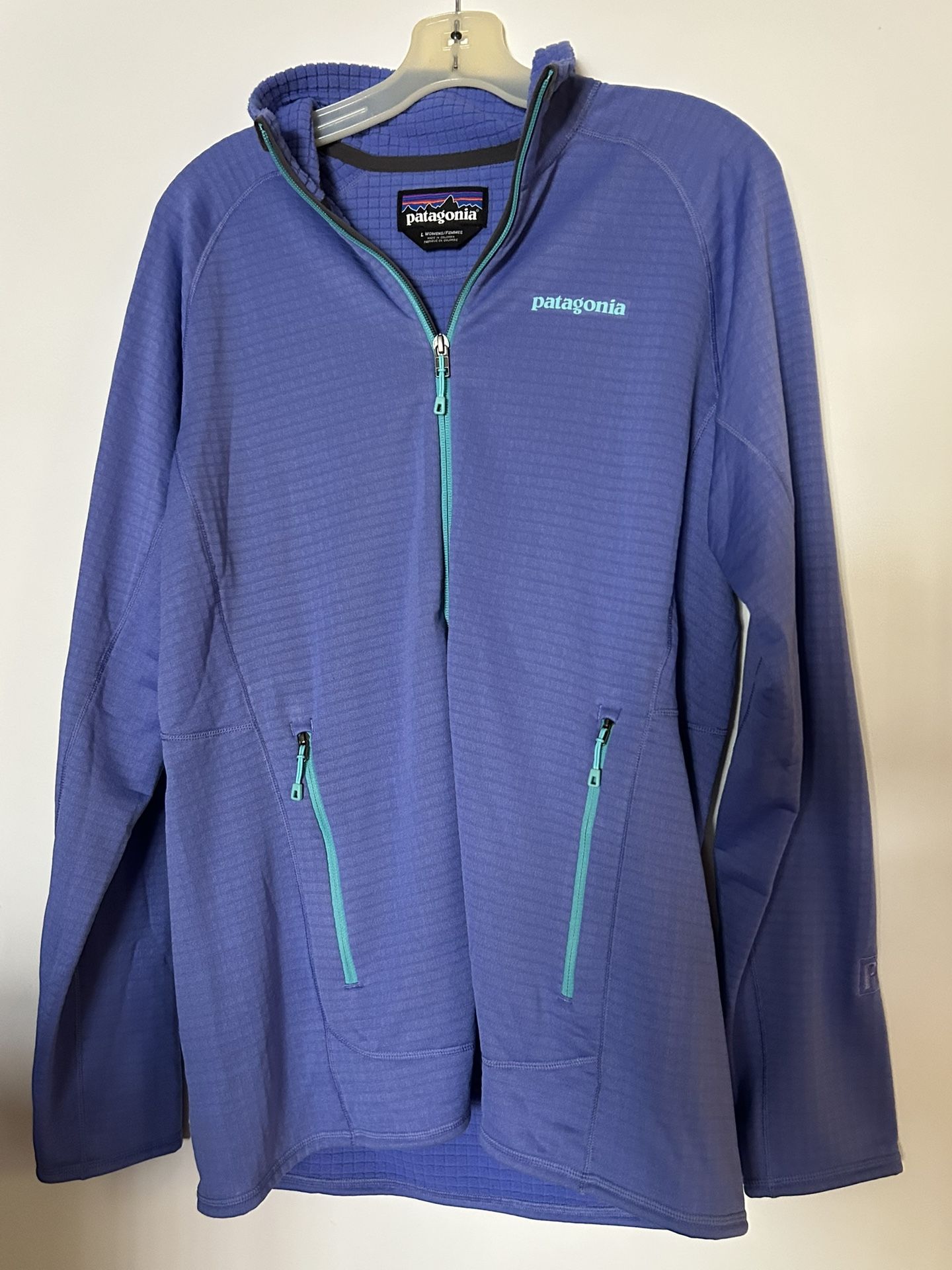 w’s R1 Full Zio Jacket used , size large , VG condition, Polartec , raglan sleeves for easy movement , 2 zipper front hand warmer pockets. With mesh pockets , hemed cuffs , light purple lilac color