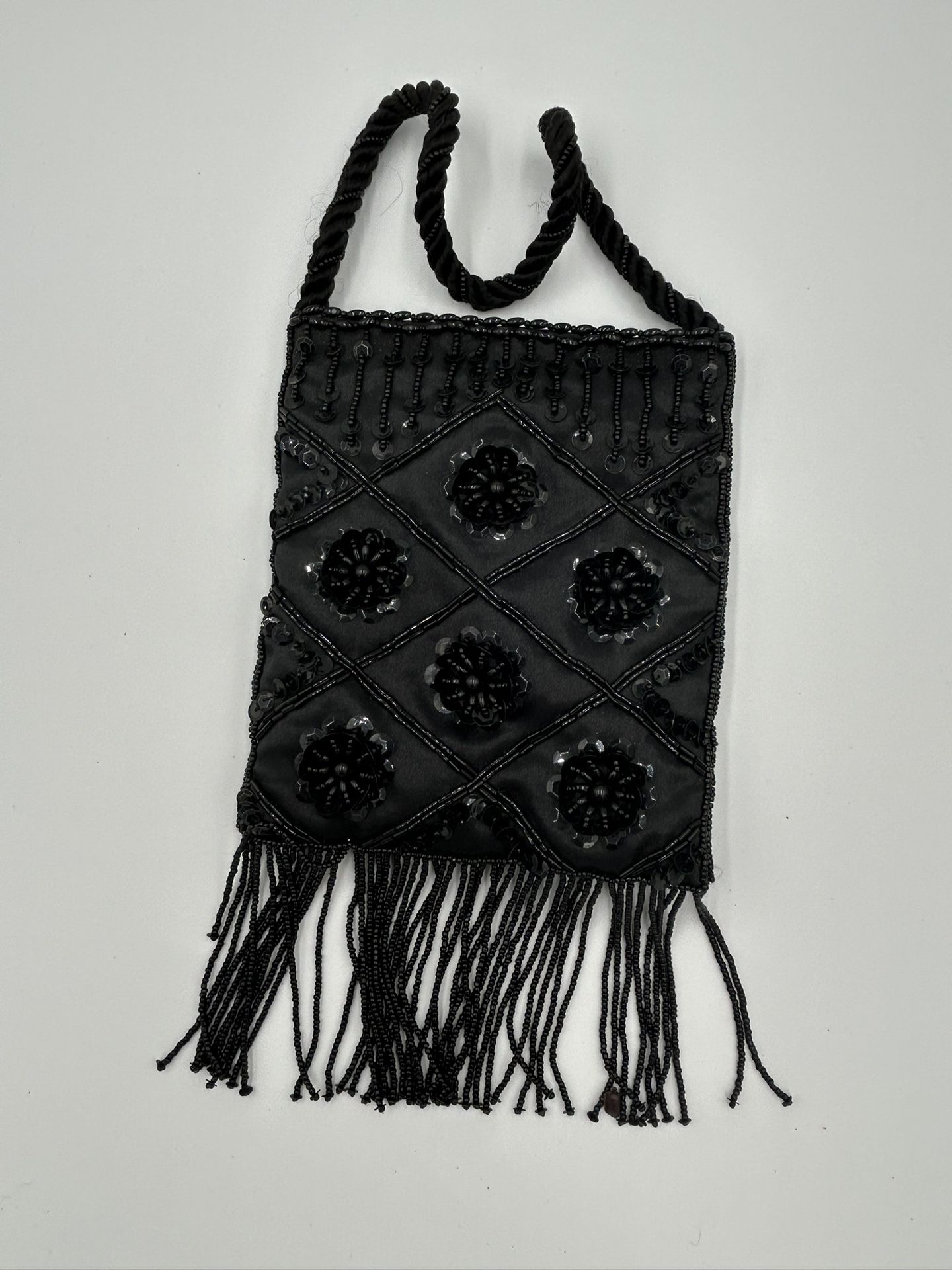 Sasha Of New York, Black Beaded Satin Purse With Bead Handle And Bead Fringe