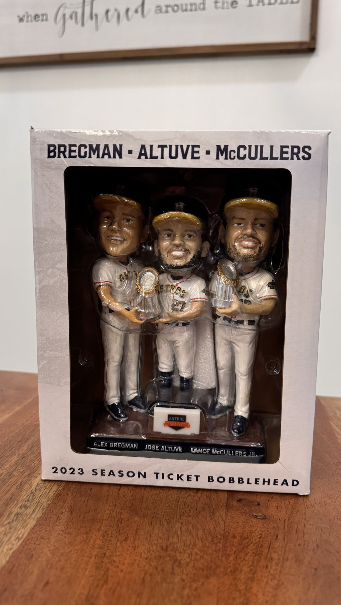 Astros bobble-heads for sale. They are in new condition and have never been opened. - 2023 Season Ticket Holder: Bergman, Altuve, McCullers. $30. - Jose Altuve City Connect. $20