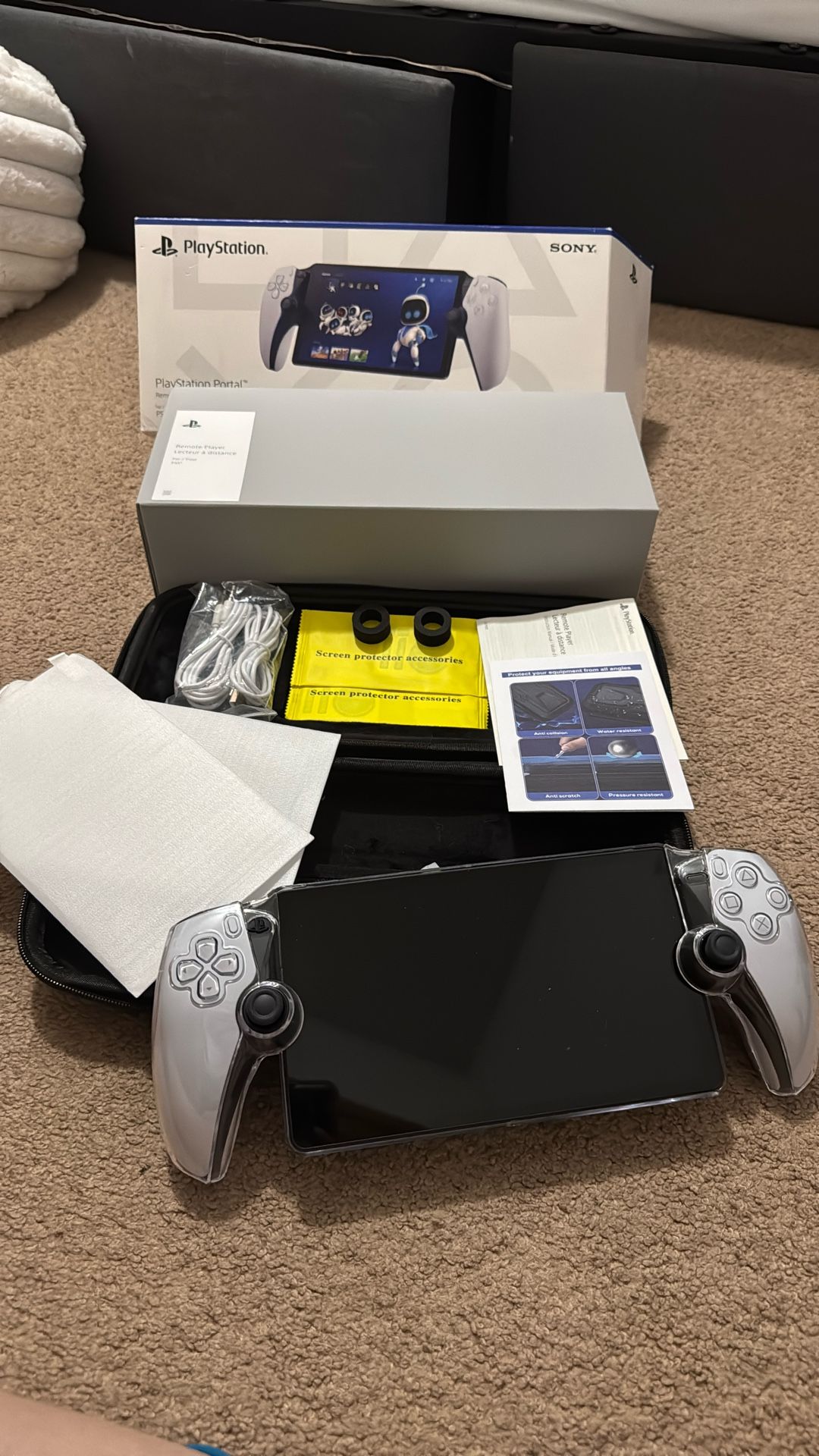 Item comes in original box with add ons including: Two unused screen protectors with accessories to apply them, separately purchased case/carrier with handle, two joystick protectors, original manuals, charging cable and aux cable. New out of box only used twice no scratches or visible wear, is ready to use, and charges correctly.