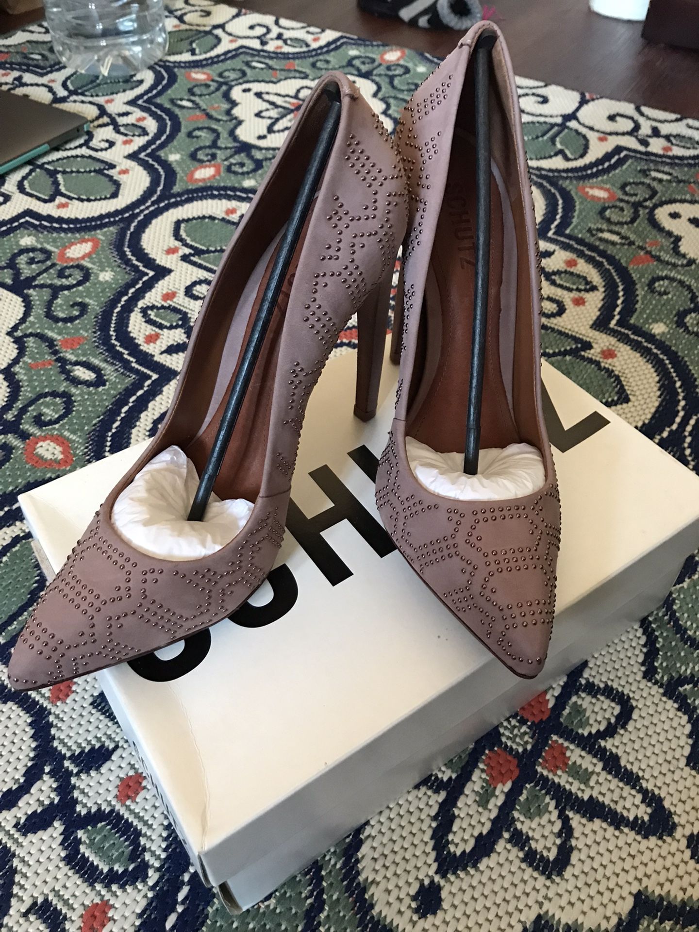 SCHUTZ Carlita Pumps in mauve size 10 Nubuck upper, leather lining, leather sole Imported Pointed toe; studs at top; floating mini-platform 4" heel Bought from Bloomingdale’s. Brand New with dust bag #studs #pump #mauve #bloomingdales