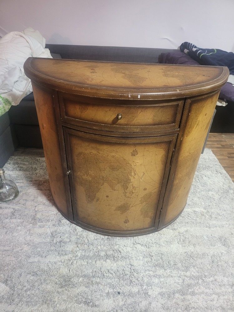This charming demilune cabinet features a world map design, perfect for adding a touch of vintage elegance to your home. It offers a spacious drawer and a cabinet with ample storage space behind the door. The cabinet is in good condition and would make a great addition to an entryway, living room, or dining area. Demi Lune World Map Motif 1 drawer 1 Door Accent Chest Demi Lune World Map Motif (1) Drawer (1) Door Accent Chest Width: 37.5"w Depth: 17.5"d Height: 33.5"h Item Number: 17730-45 Item ID: 96144 Category: Accent Chests