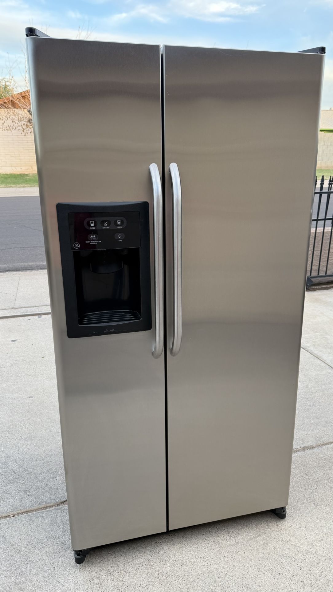 REFRIGERATOR GE STAINLESS STEEL EVERYTHING WORKS.. MEASUREMENTS 33 WIDTH 66 HIGH 31 DEEP