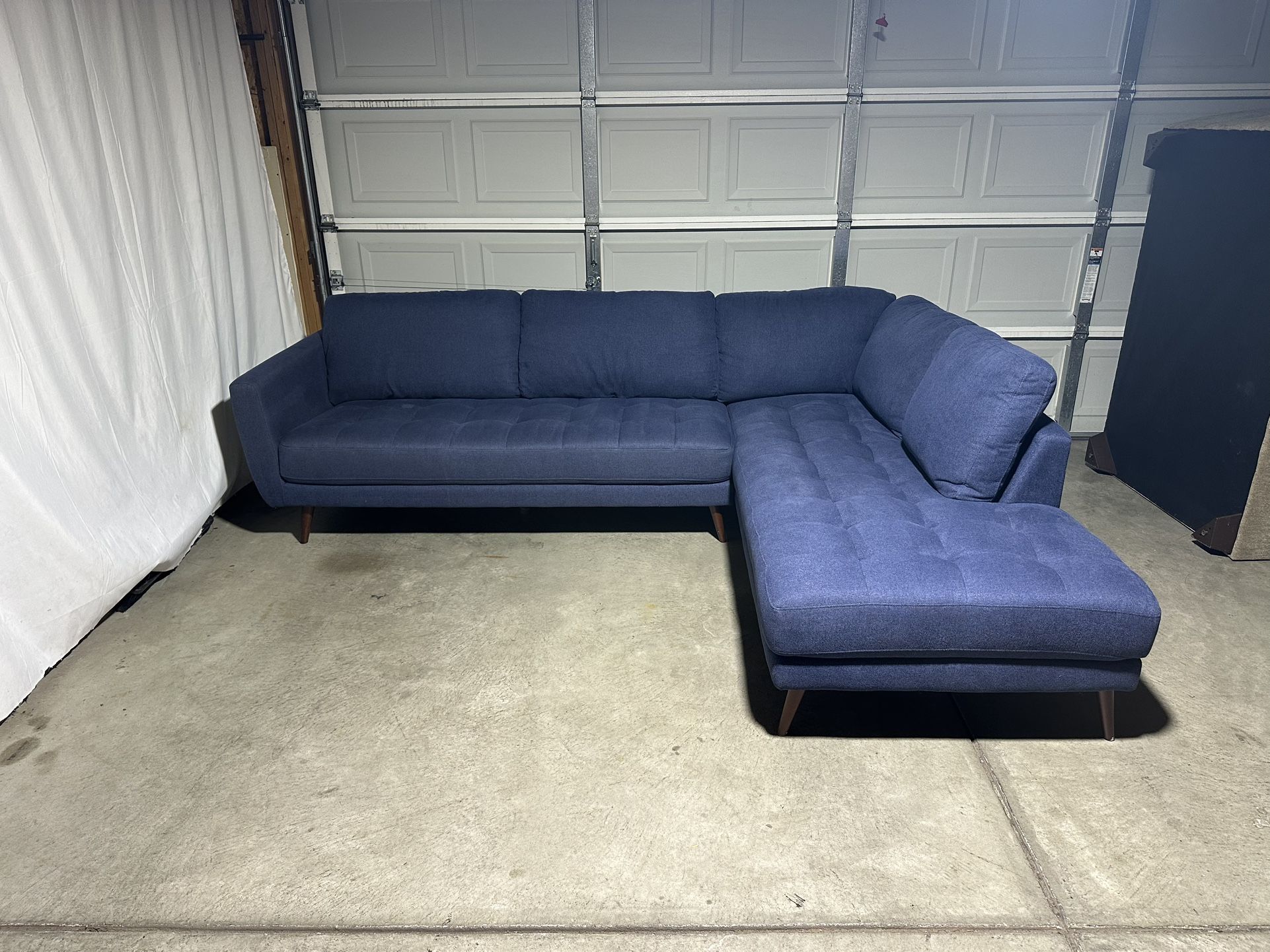 MCM Blue L-Shaped Sectional Sofa Beautiful mid-century modern style sectional in a deep navy blue. Super comfortable with tufted cushions, supportive backrests, and a spacious chaise lounge. Perfect for living rooms, apartments, basements, or a cozy media space. Removable Top Cushion Covers for easy cleaning No rips Smoke Free and Pet Free Breaks into 2 pieces for Easy Moving Dimensions 108.5 inches By 82.5 inches by 26 inches tall 🚚Free Delivery🚚 within 10 miles of Northglenn Affordable delivery available outside the area 💬 Message me with any questions or when you would like to schedule Delivery