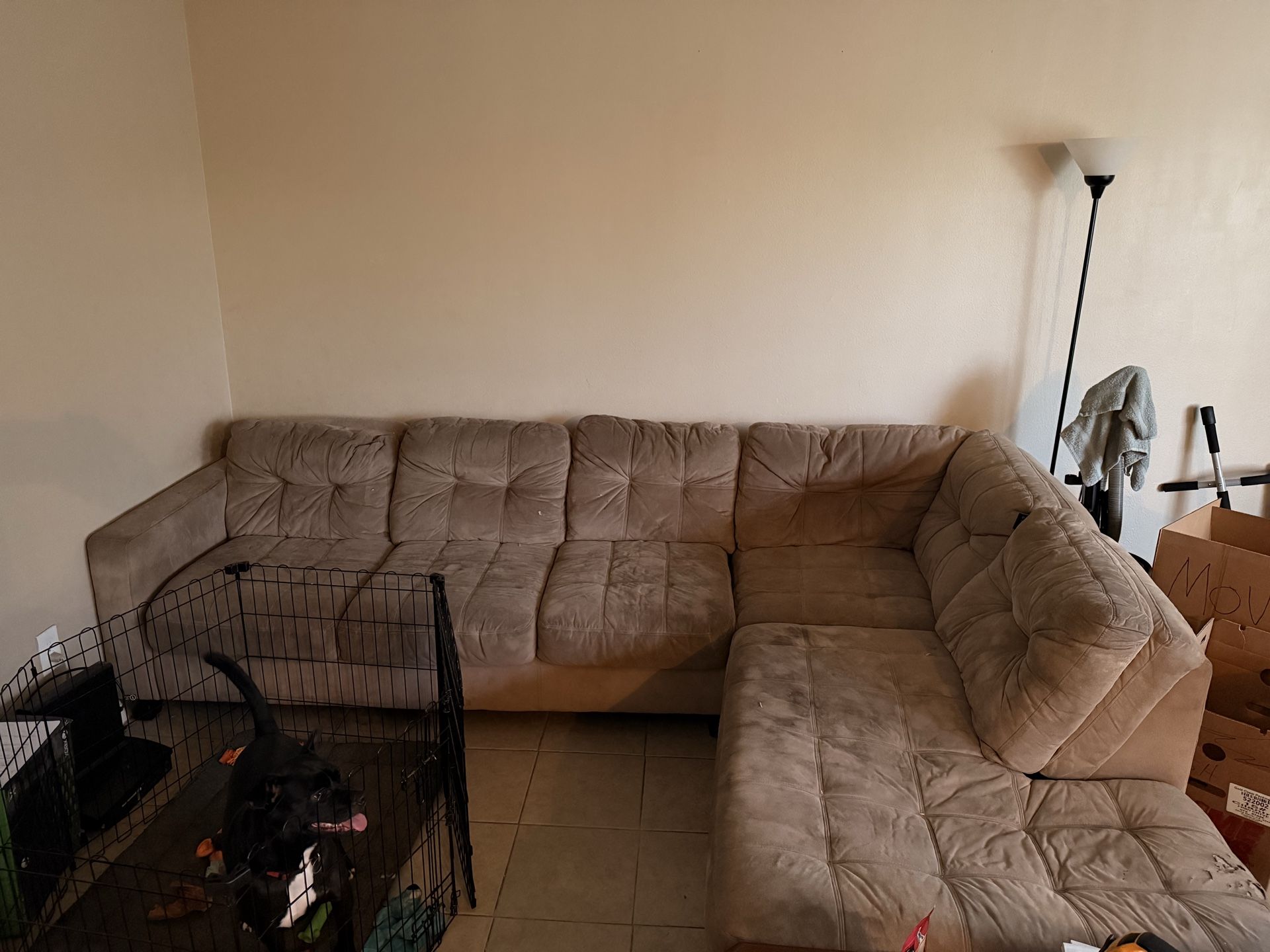 Beige sectional couch honestly it just needs a good cleaning it has a few tears on one side but not bad. I’m moving out soon need to get rid of it Asap! Dog not included…