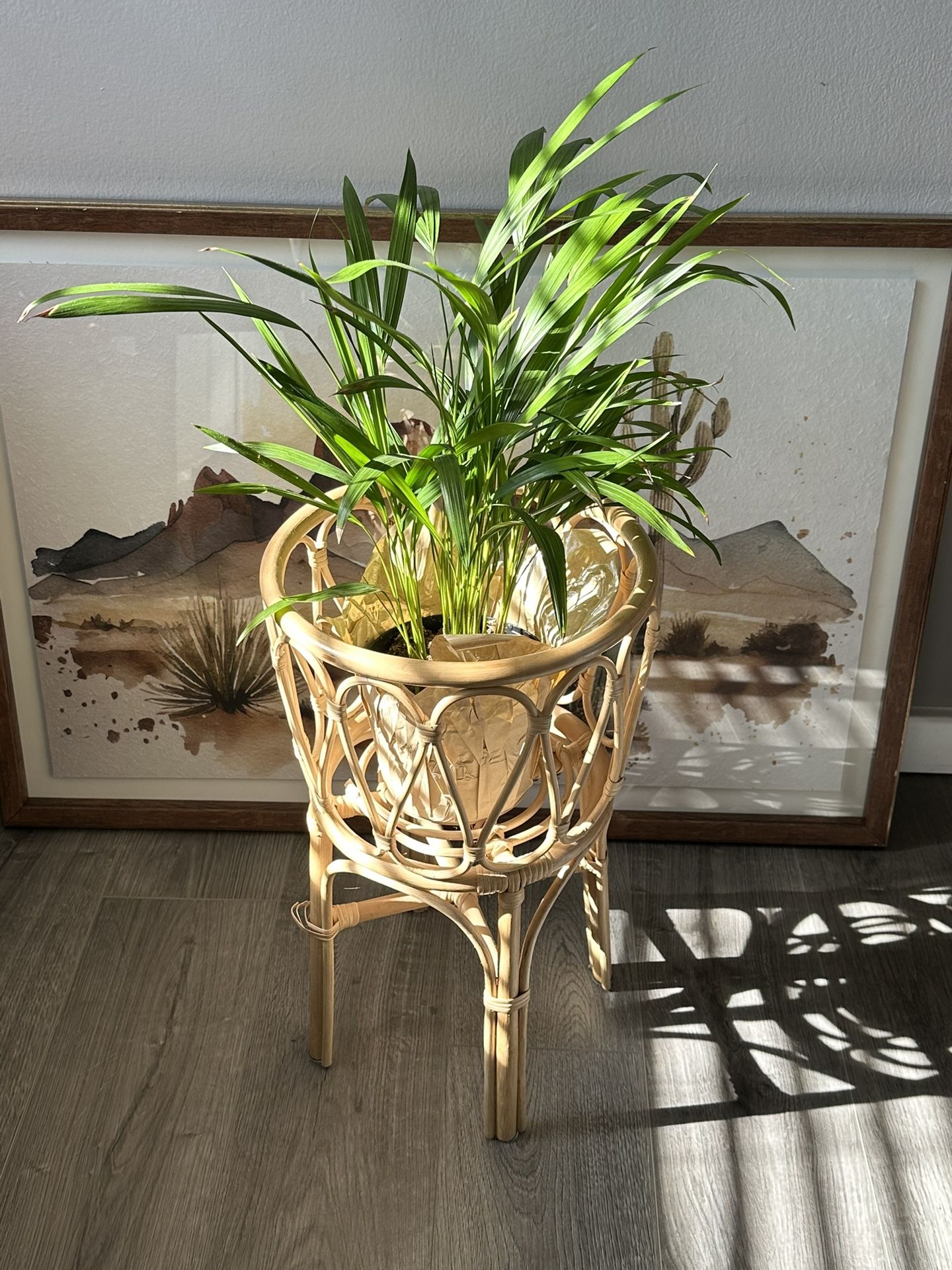 Small Wicker Plant Basket Stand diameter - 10in height - 20in Has small imperfection as pictured.