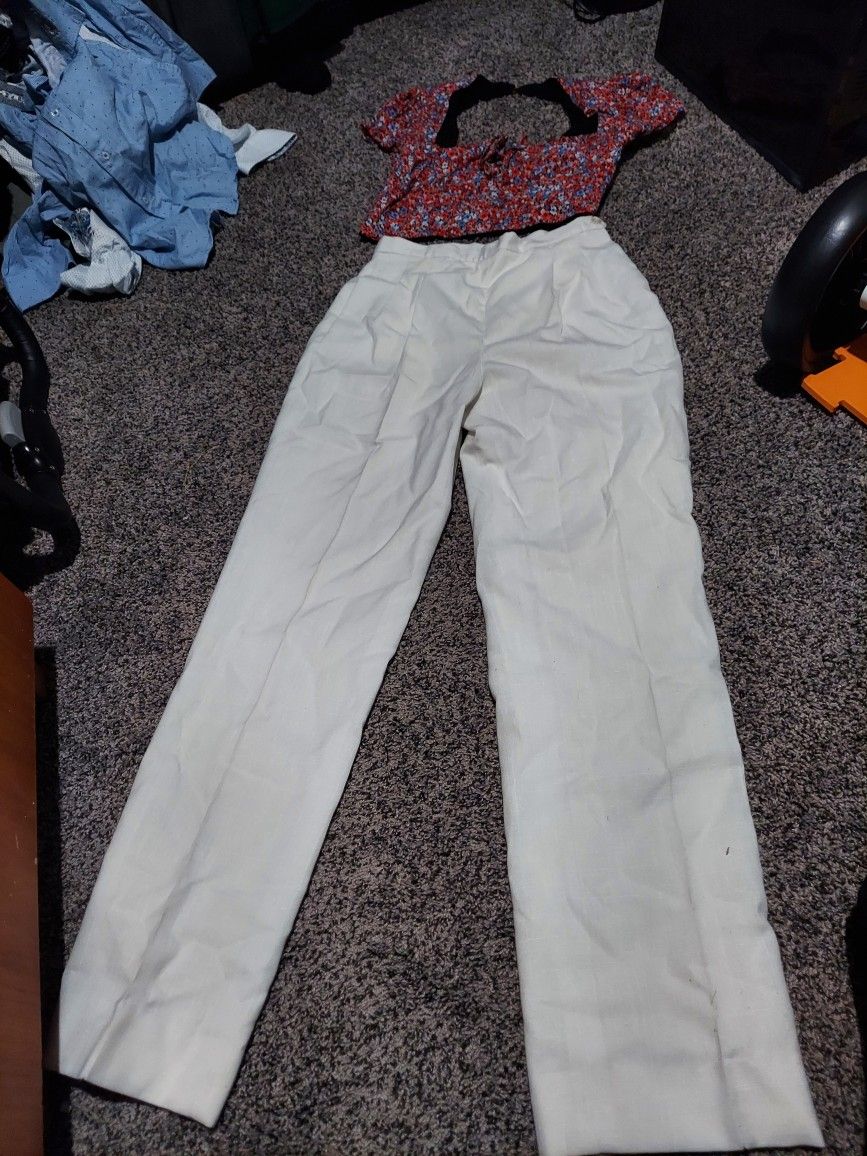 white pants size 3-4 green and black pants with stripes size s blouses size s-m Everything is sold together for pickup in Lakewood.