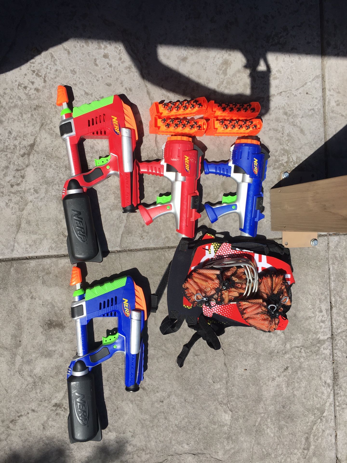 4 NERF guns, 4 magazines for the two larger guns (40 darts), 4 velcro vests (2 red, 2 blue), 4 safety glasses and 4 bags of 30 velcro darts (120 darts) 160 DARTS TOTAL