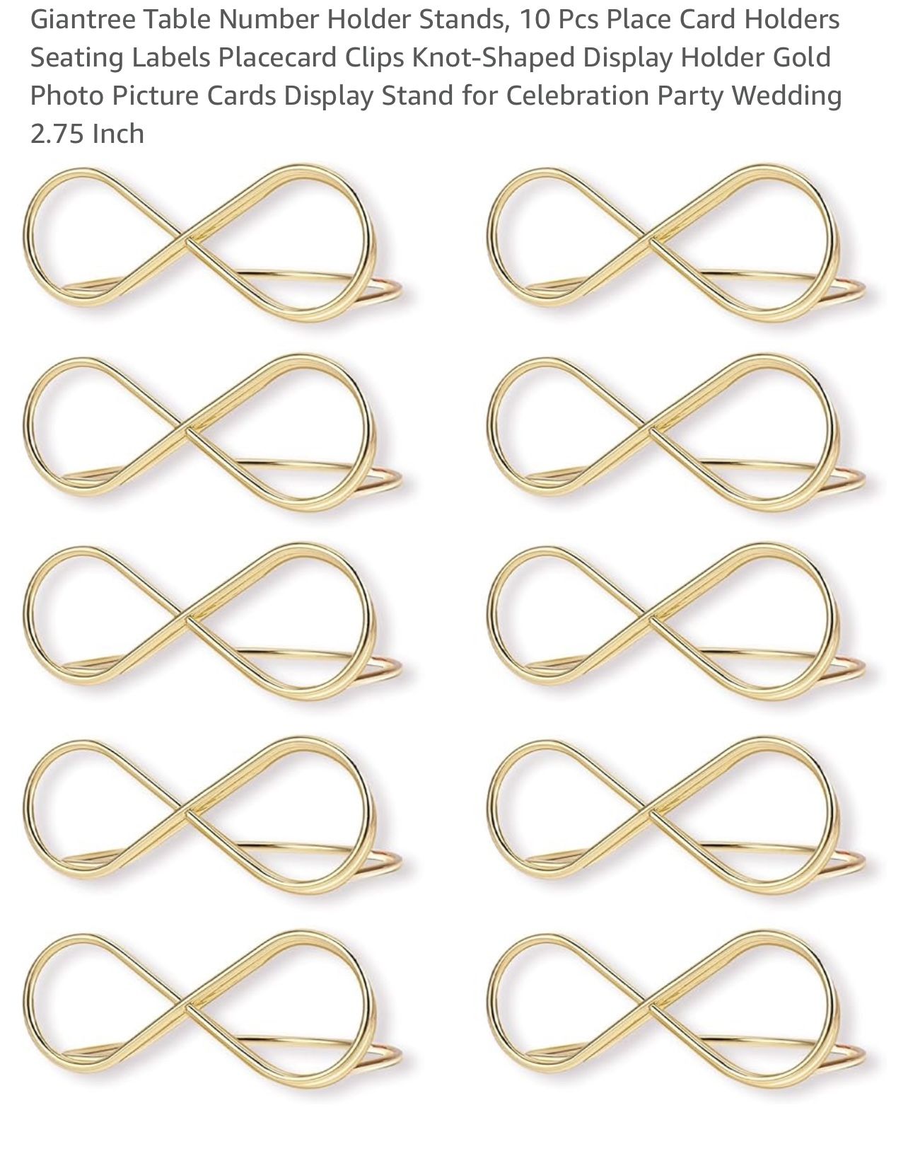 Giantree Table Number Holder Stands, 10 Pcs Place Card Holders Seating Labels Placecard Clips Knot-Shaped Display Holder Gold Photo Picture Cards Display Stand for Celebration Party Wedding 2.75 Inch Price: $5 Pick up by Tustin District Please see the sample. What we did.