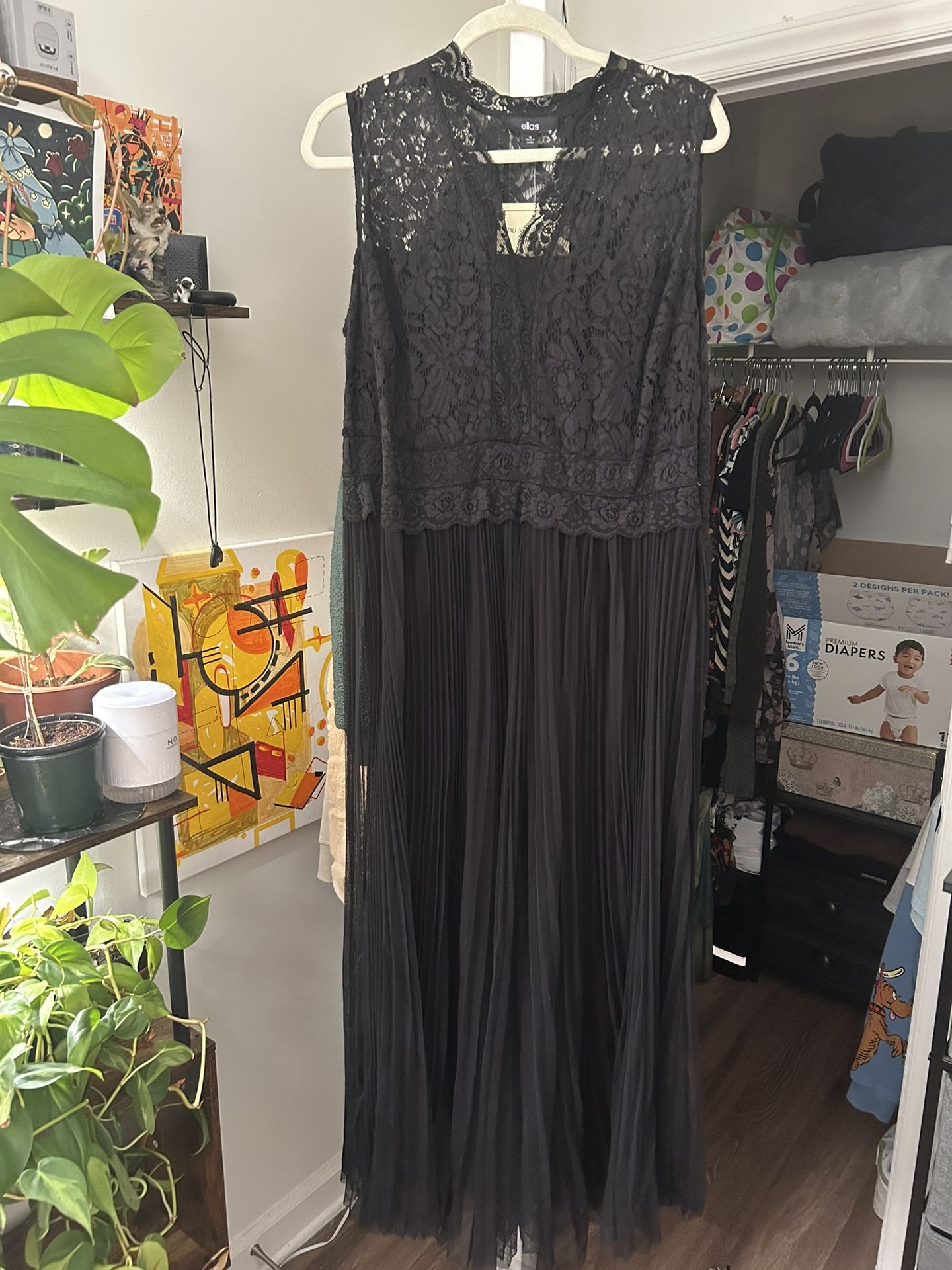 Long black dress with lace detail. Never worn. Size 18