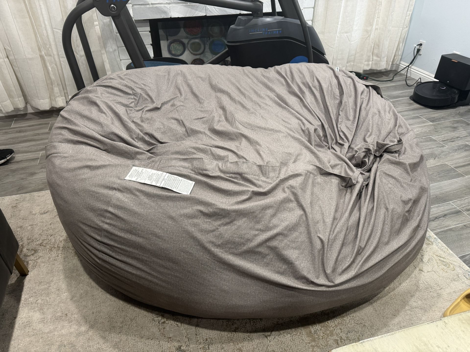 It’s about 7 months old. No room for this big bean bag. Smoke free home. Comes with original bag but no way to get it back inside the bag.