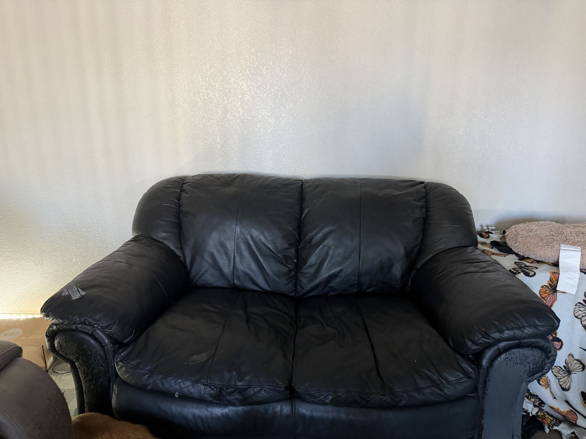 Black bonded leather loveseat for sale. Very comfortable and sturdy frame. Perfect for apartment, first place, garage, or extra seating. • Seats 2 comfortably• Cushions still supportive• Some peeling on arm (see photos) – cosmetic only• Priced lower because of wear Still has lots of life left! Pick up only. Message me if interested 🙂