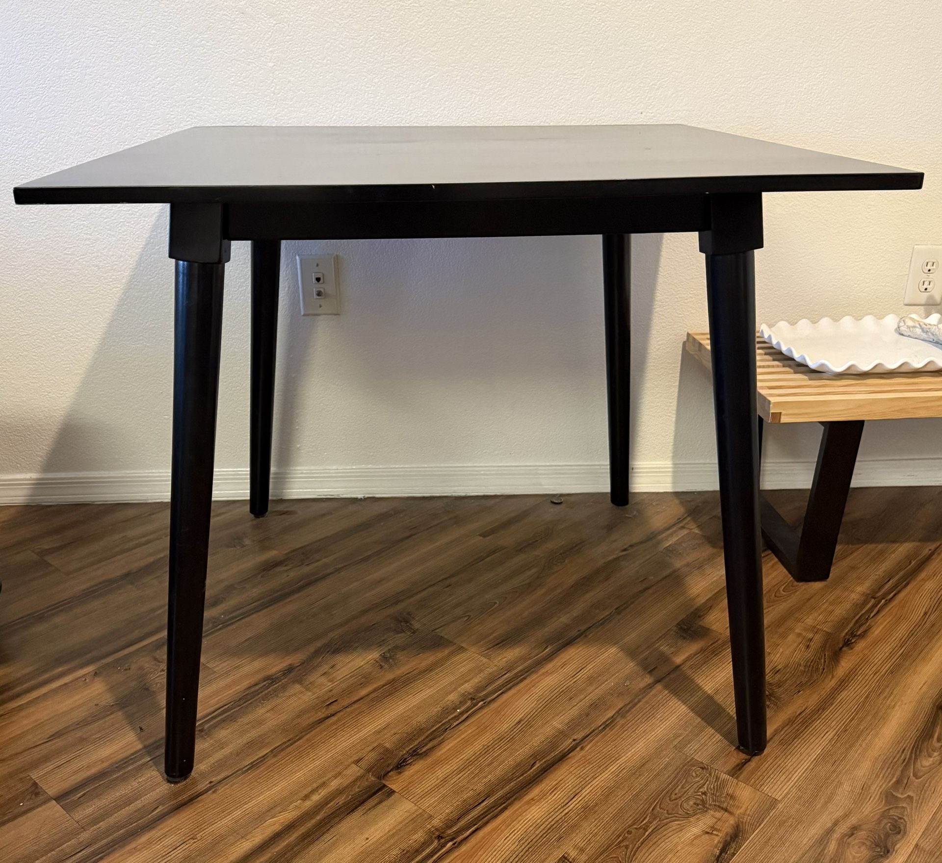 Black wood dining table. 3’ x 3’ **must pick up** Non-smoking, no pet home