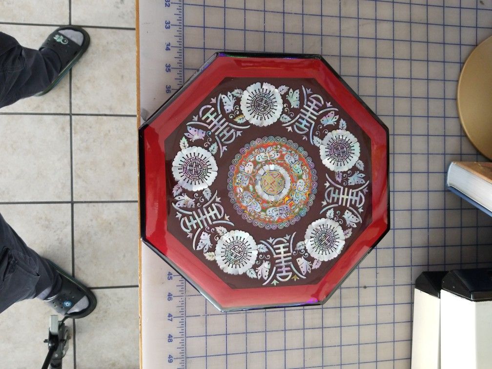 OLD CHINESE INLAID MOTHER OF PEARL LACQUERED WOOD JEWELRY OCTAGONAL BOX