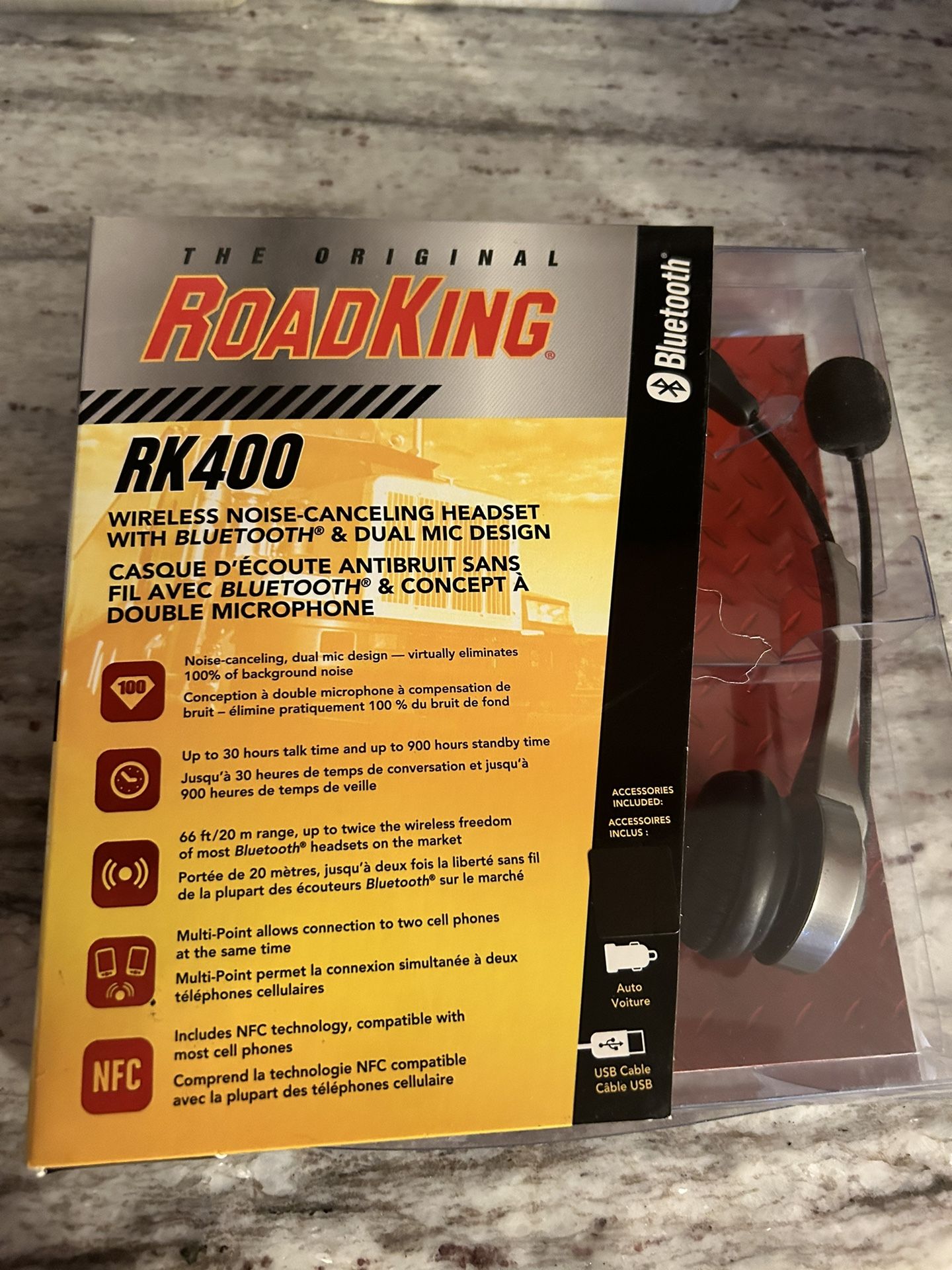 ROADKING RK400 WIRELESS NOISE-CANCELING HEADSET WITH BLUETOOTH INCLUDES AUTO CHARGER AND USB CABLE WALL CHARGER NOT INCLUDED