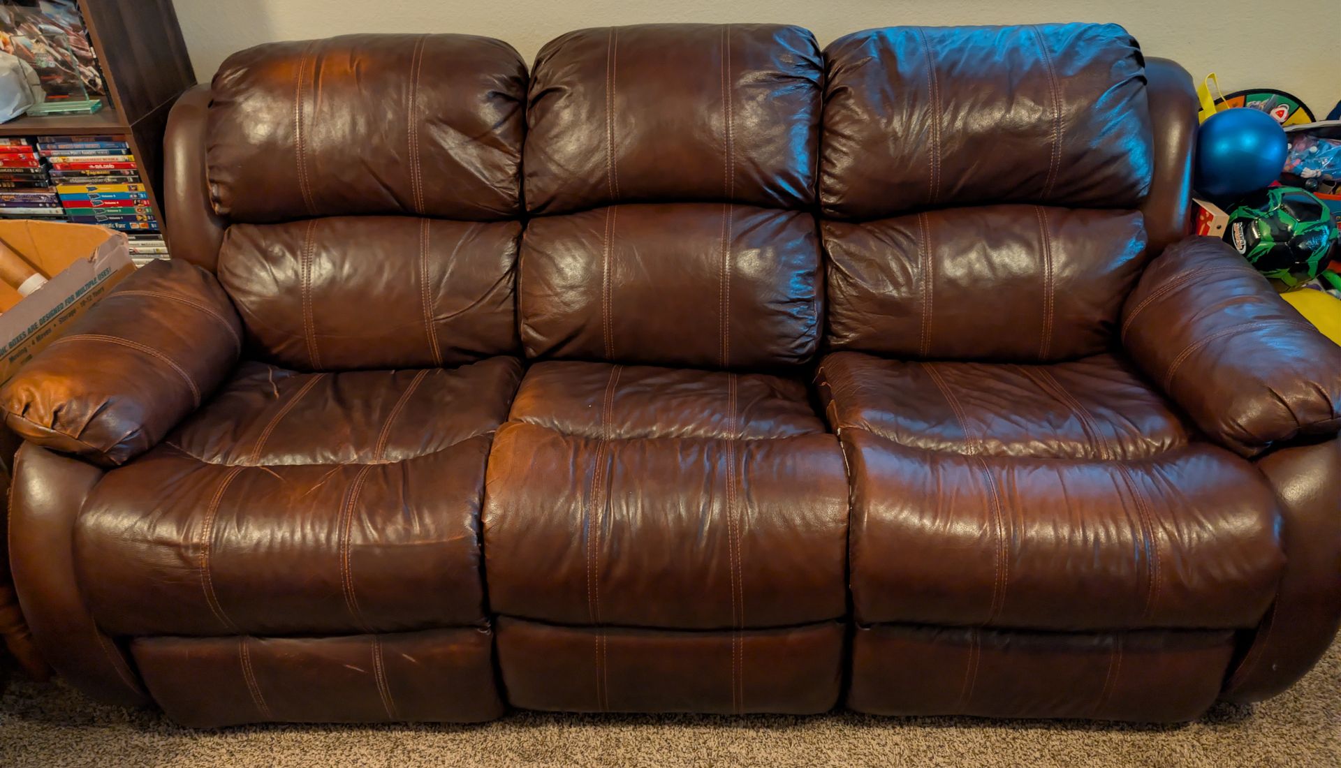 3 seat reclining leather couch. Free. No delivery, must pickup. Flexsteel, leather sofa, reclining couch, brown leather, 3 person sofa, recliner, living room furniture, heavy duty, quality leather, home theater seating, free sofa, giveaway, comfortable, dark brown, triple seater, manual recliner, metal frame, durable, furniture giveaway