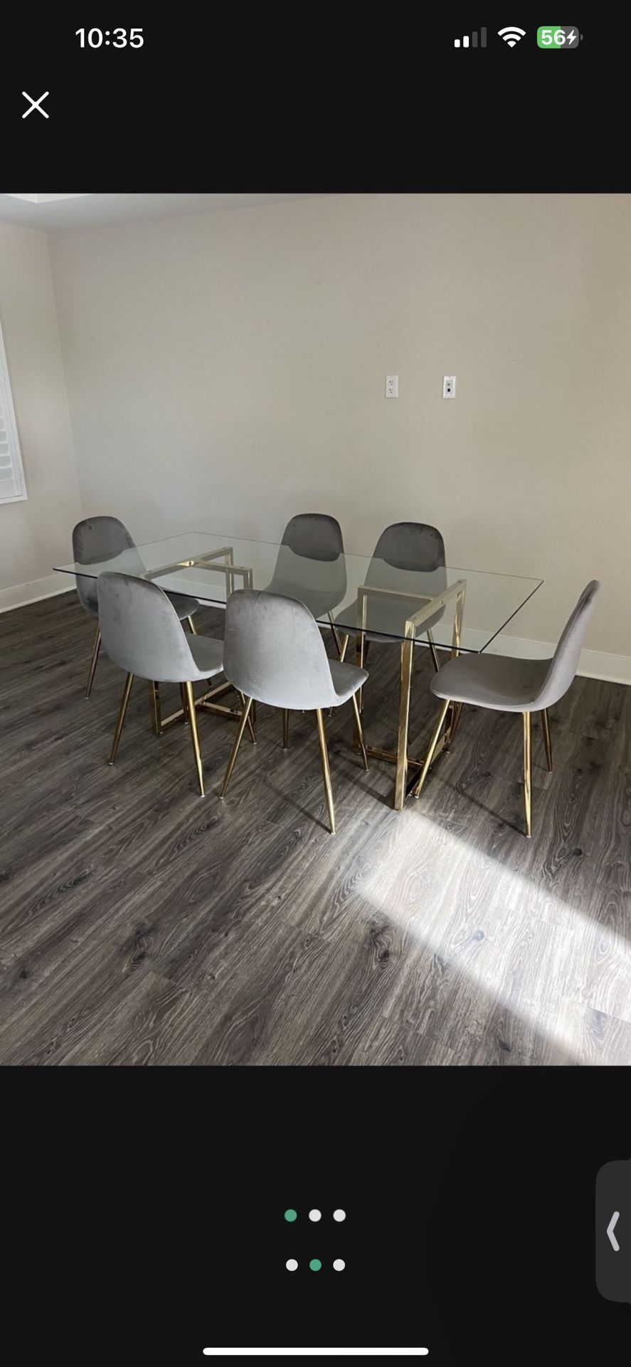 New in the box - 71”x35” dining table - Tempered glass top - Gold chrome legs - 6 Gray velvet chairs - Perfect for big families - Sturdy rectangular kitchen table Table Dimension 71” x 35” x 30” (W x D x H) You can pick up or delivery is available for extra fee.