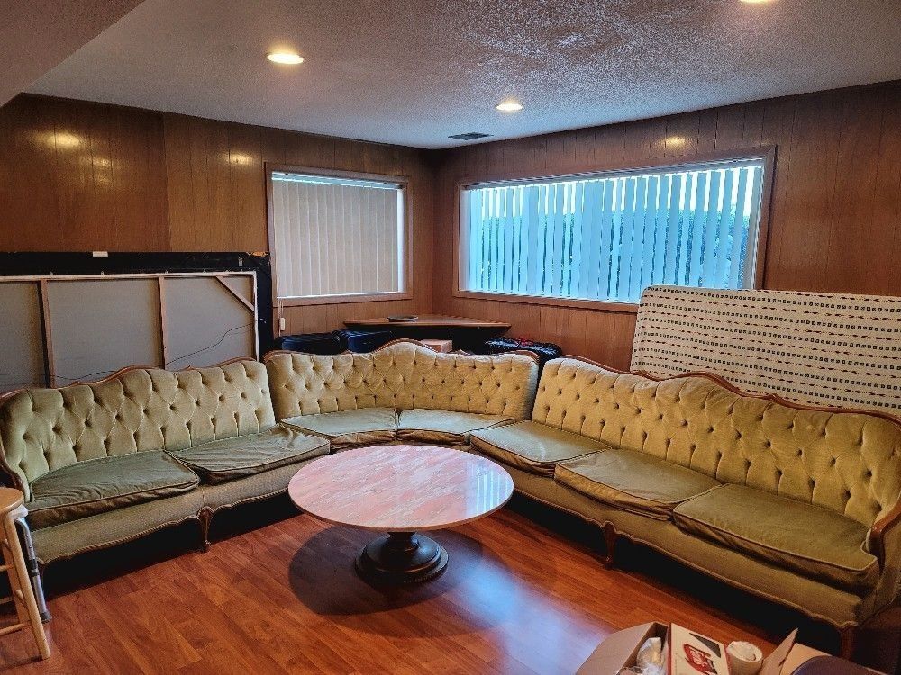 We had this sectional since the day we moved in. There needs to be work done on the couch Needs some upholstery. The padding needs to be replaced. There's some stains on there as well that needs some cleaning. Selling as is. $300 or Best offer. Table does NOT come with the set.