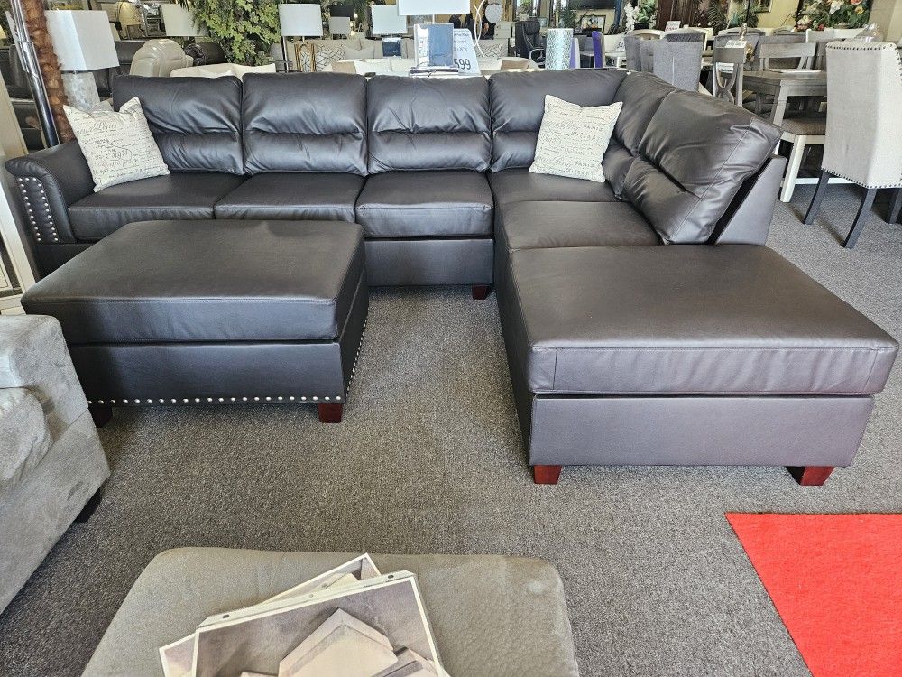 Brand New Brown Bonded Leather Reversible Sectional + Ottoman (112"×84")