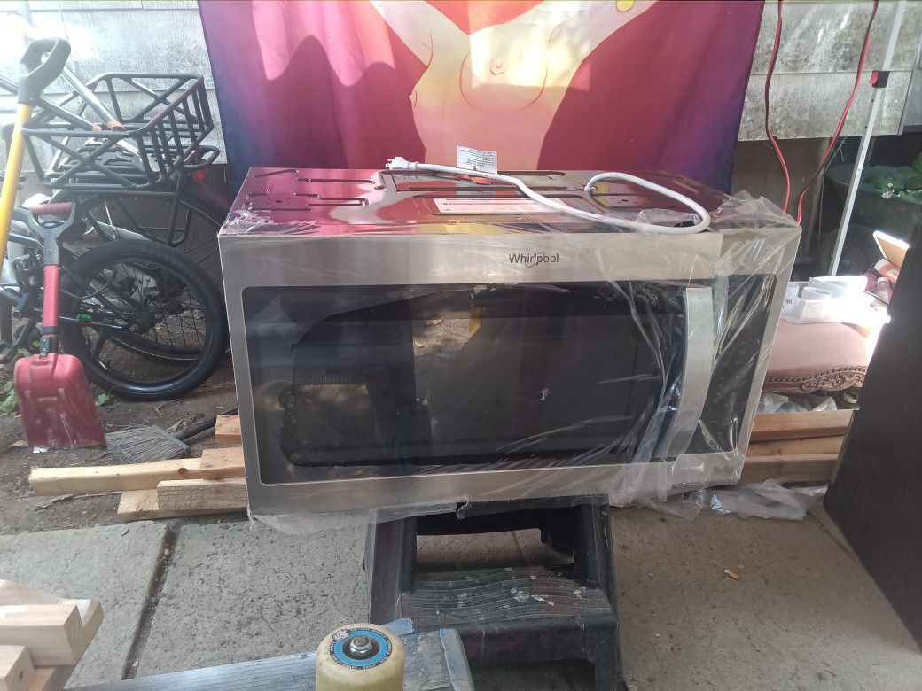 This is an above range microwave. New. Never used. Out of box. Still has plastic wrapping around unit Must pick up. I cannot deliver. The 2nd pic includes all hardware and accessories that are included. *I am looking for the glass rotating tray. However, price already reflects discount that it will be sold as is and without the tray. Message me for any other questions you might have!