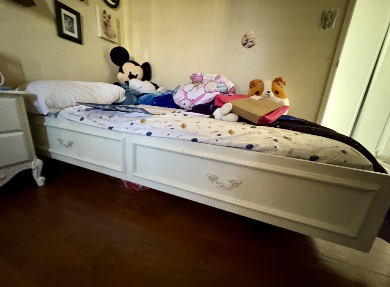 Girls bed frame only • No mattress Photos show crack in one piece of under the bed- but it doesn’t effect the bed ( sold as is ) Has all slats and will give you the 4 black boosters shown in photo 45$ or OBO