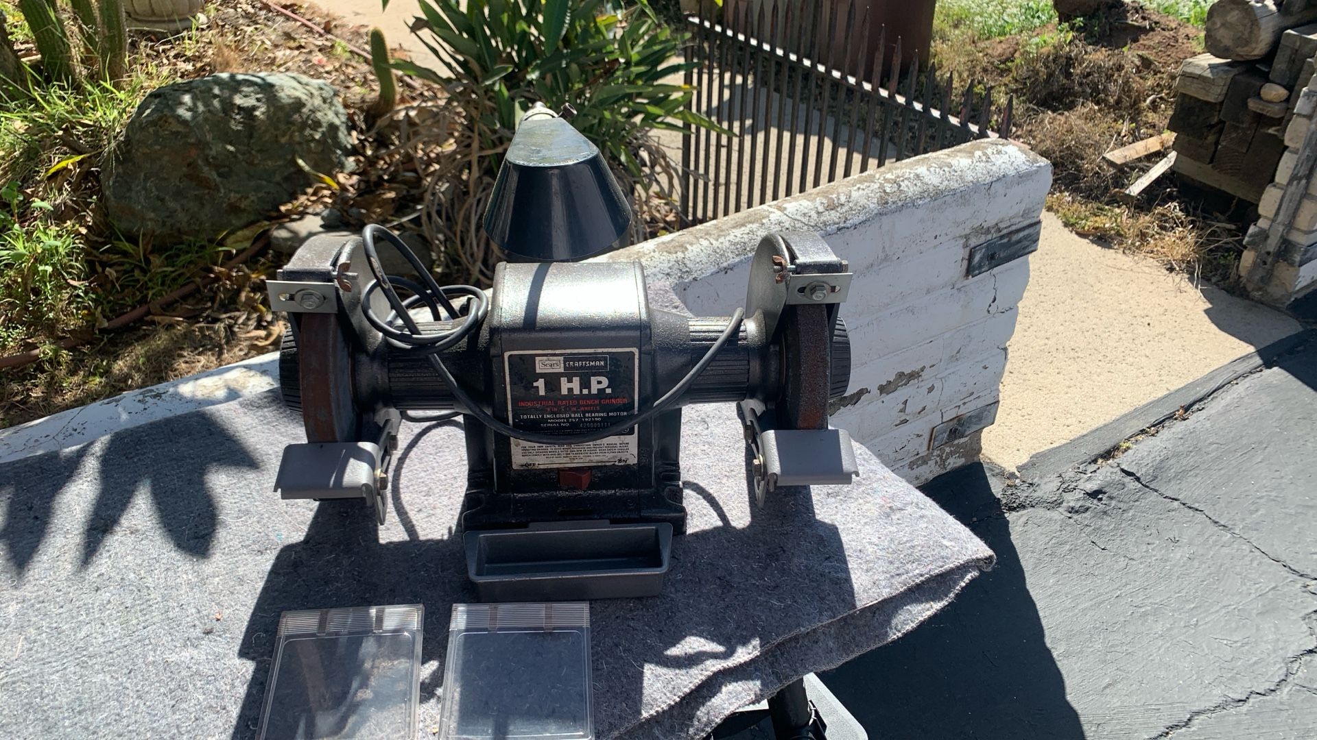 Complete with light, quench tray, eye shields and tool rests. Industrial rated grinder. 8” grinding wheels.