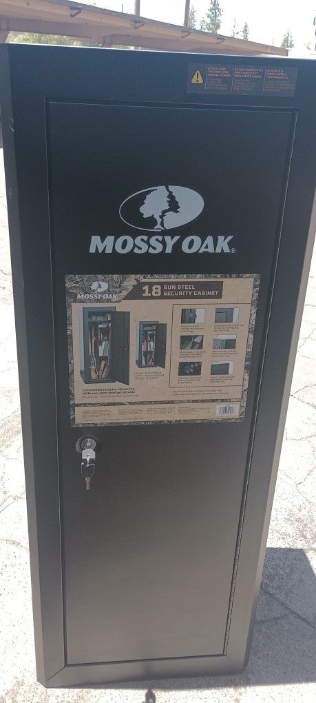Product details The Mossy Oak 18 Gun Security Cabinet is perfect for keeping your firearms in a safe place. This security cabinet is made of welded heavy duty steel with rust resistant powder coating. It has beveled front edge and features multiple interior configuration options. It allows for 18 long guns with molded barrel rests and 4 scoped rifle standoffs. The 3-point lock and full hinge door keep your firearms secure. High quality EVA foam liners for each shelf included to protect your firearms from scratches. Dimensions of the cabinet are 21 in. x 18 in. x 55 in. and it weighs 80 lbs. Secures 18 rifles or shotguns up to 54” tall Pre-drilled holes for easy attachment to floor or wall Interior cabinet assembly required High-quality EVA foam liners included for scratch resistance Molded barrel rests and 4 standoffs for scooped guns Customizable Interior for shelving and barrel rests Reliable full hinge door for reliability and security California DOJ approved Firearm Safety Device 21 in. x 18 in. x 55 in. Secure 3-point locking system with two keys