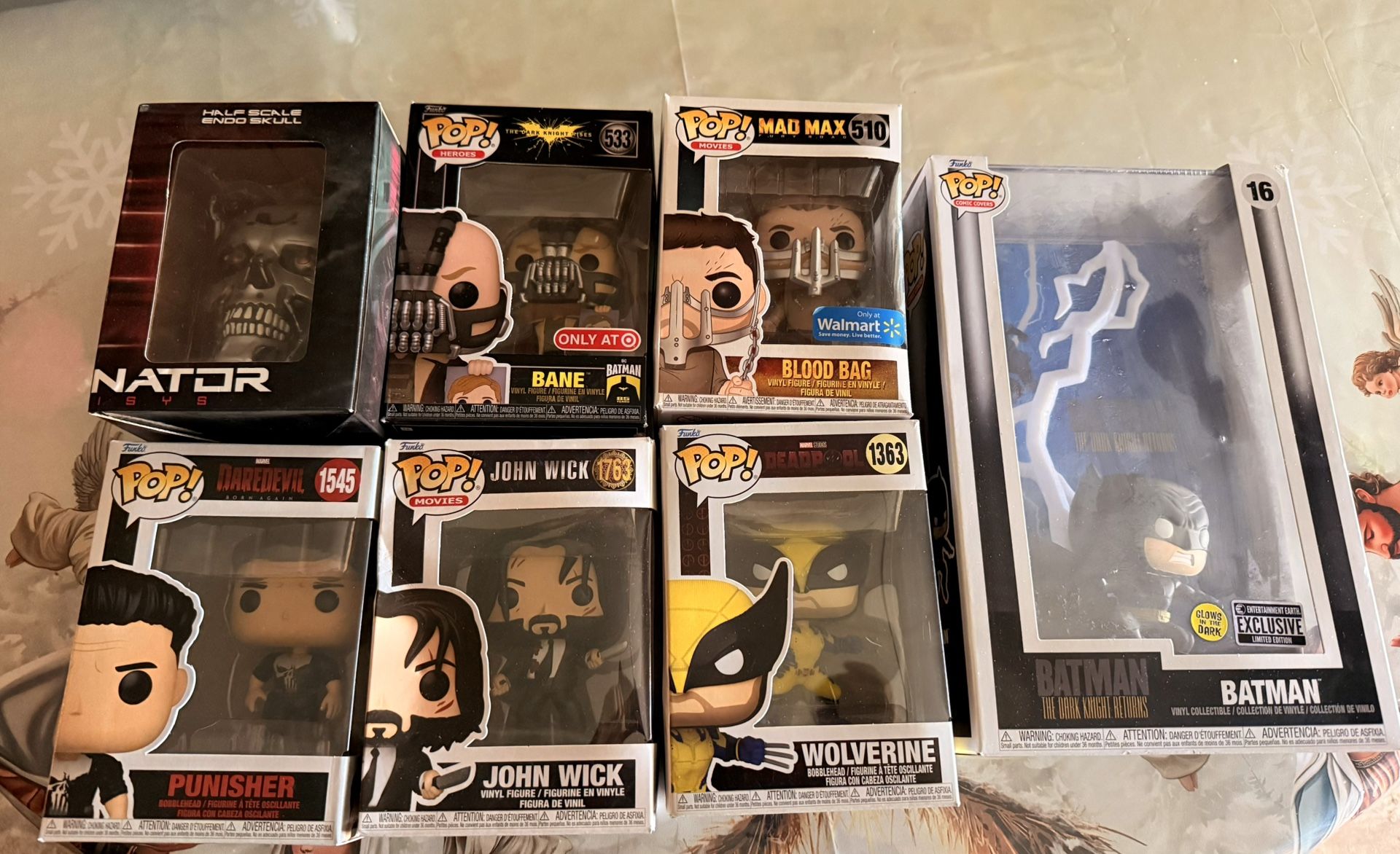 Bundle deal if you take all and I’ll include Terminator Half Scale Skull for free! $140 Like new, never opened (kept in smoke free environment) Sold separately prices: Batman “The dark knight returns” (Glows in dark): $45 Wolverine (Deadpool & Wolverine): $25 John Wick 1: $25 Punisher (Daredevil born again)$25 Bane exclusive (Dark knight)$30 Terminator half skull: $20