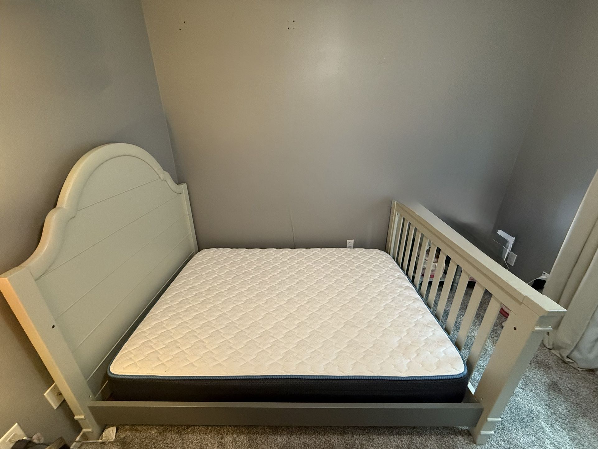 Million dollar baby crib converted to full size bed. Very sturdy! Minimal scratches. Mattress not included.