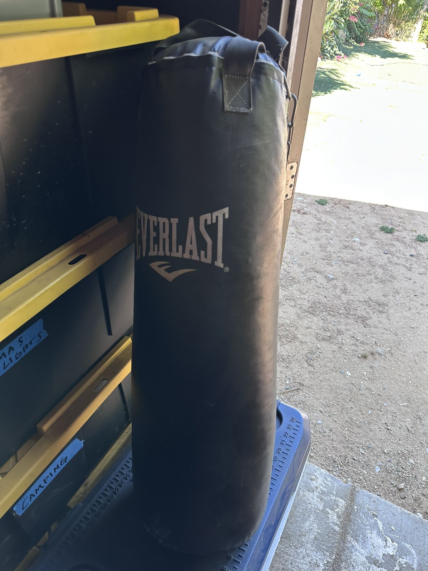 Used Everlast boxing heavy bag. No rips. Still solid and in great shape. Just needs a little wipe down. With hanging bracket and chain. Not 100 lbs. was told most likely 70 lbs bag.