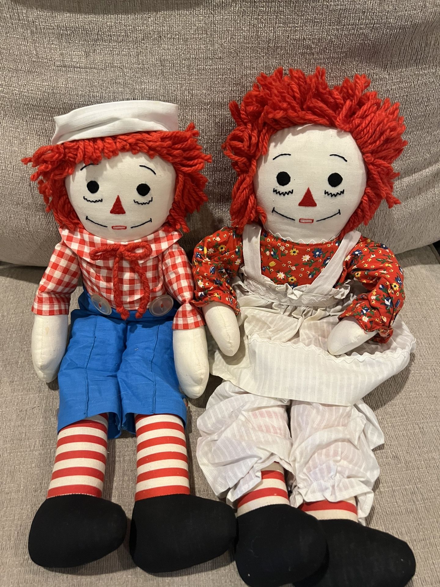 Vintage Raggedy, Ann and Andy doll. They measure 19 inches, Handmade dolls and clothing. Wonderful condition.