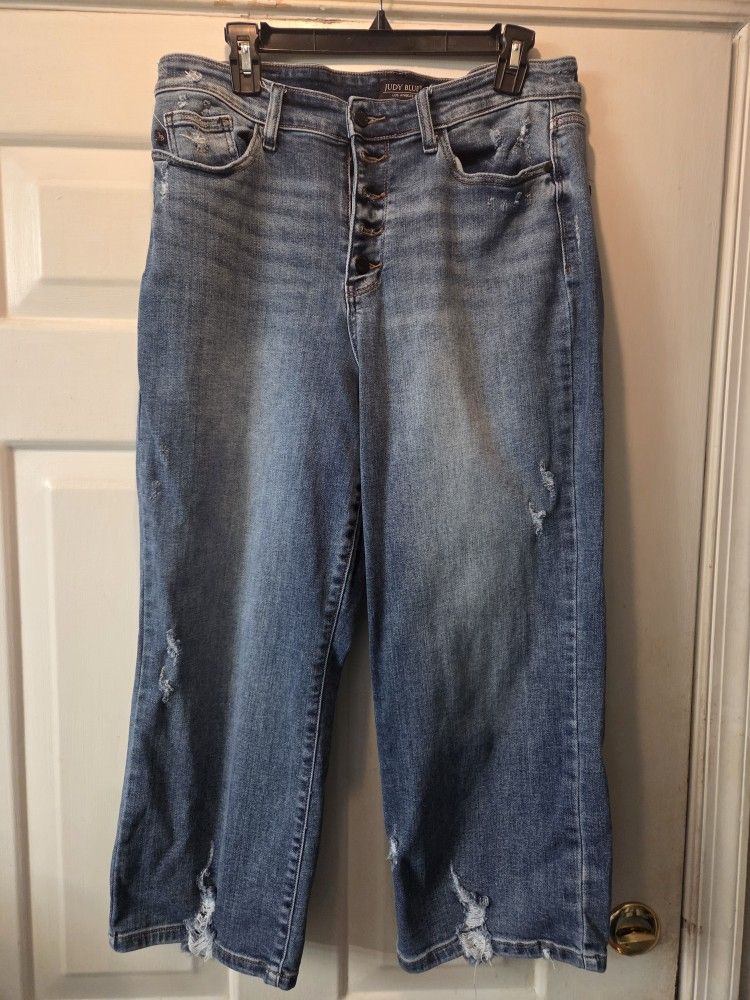Trendy high rise jeans with subtle distressing. Soft and comfortable. Ideal for everyday style. Wide legs. 13/31