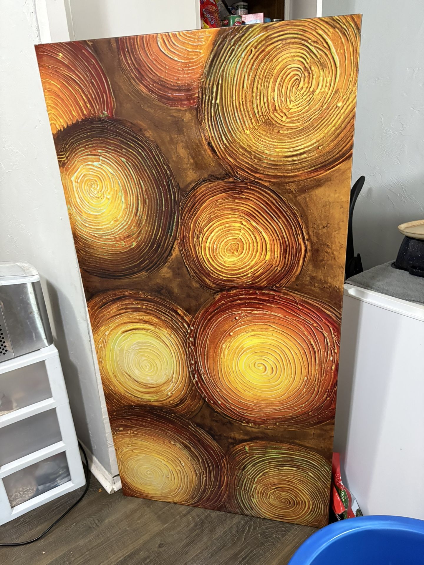 30x60 Multi-Color Canvas Spirals Rings Wall Art Price is negotiable on with a price first come first serve. displays a large piece of textured wall art featuring a pattern of concentric circles in warm tones of orange, yellow, and brown. This style of artwork is often created using impasto techniques, where paint is applied thickly to create a raised, textured surface