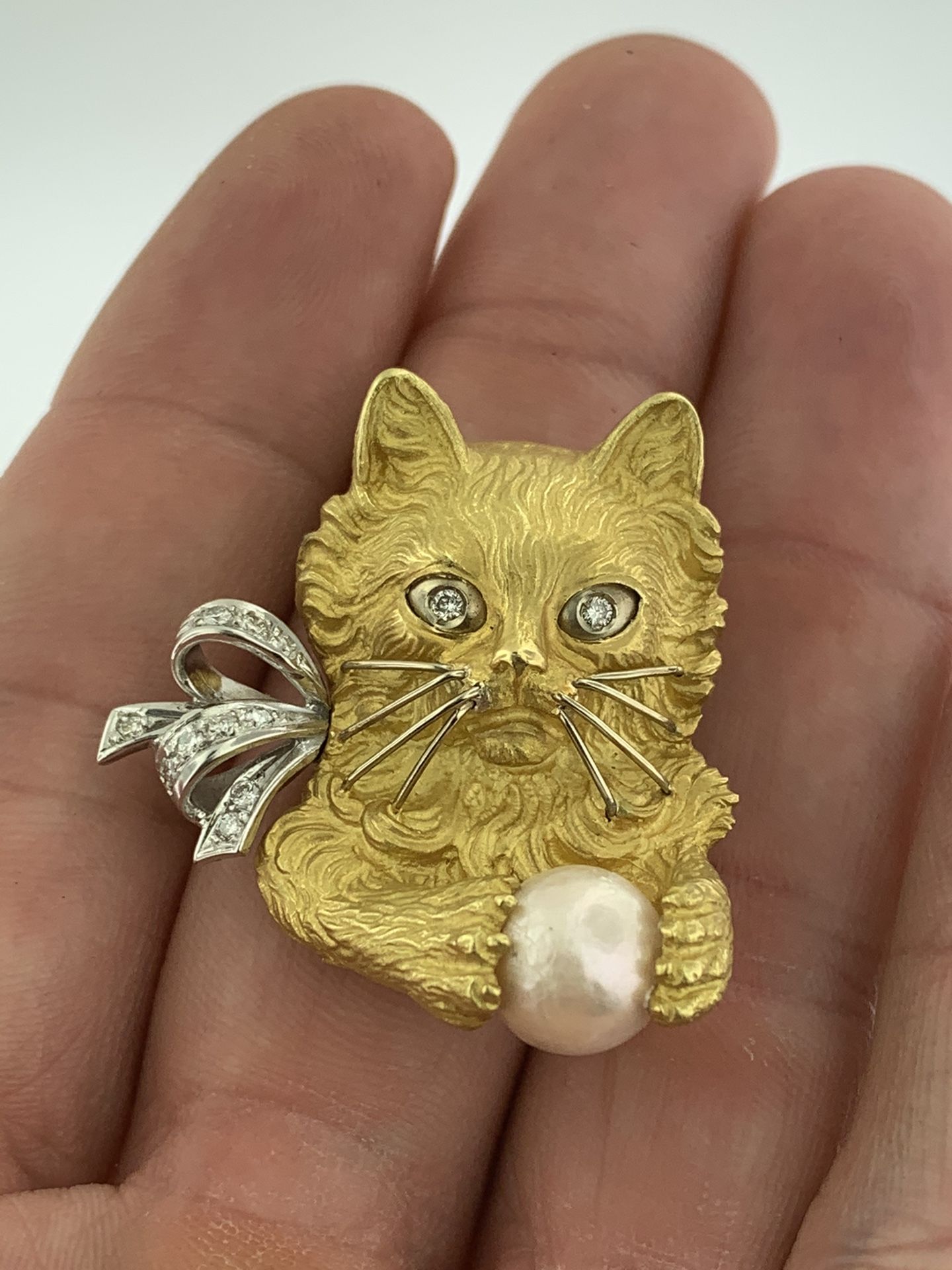 For sale: Unique 18Kt Yellow Gold CAT Diamond & Pearl BROOCH Pin Pendant~22.5 Grams~WOW! PLEASE READ ENTIRE DESCRIPTION BEFORE PURCHASING Brand New, Never Worn, Modern & Perfect ~ Please see pictures for details. Sold as is, as seen on pictures. This brooch is in the shape of a cat head and paws, extremely detailed holding a pearl as a ball... It contains 12 diamonds (round full brilliant cut). It is stamped: "750" and it is made in Italy... Superb detail and real life like realism in the fine Italian craftsmanship of this fine brooch... Specifics: Solid 18Kt Yellow & 18Kt White Gold Details ( Eyes, Whiskers and Bow set with diamonds) Diamonds: 0.36 Carat (TCW) Height: 30 mm or 1 1/4 Inches Depth: 16 mm or 5/8 Inch Width: 32 mm or 1 1/4 Inches Total Weight: 22.5 grams Fastening: Locking Pin Closure Mechanism on back for safe, easy and secure wear... Can be worn as a brooch or pendant with chain through the top of pin closure... Stone: One 9mm White Round Ocean Salt Water Cultured Pearl Inventory: # 3315 Please be 100% sure of your purchase before buying, as we do not offer refunds. We are more than happy to provide any specific pictures, or answer any questions you have regarding our items. All jewelry is Authentic ALL INCLUDED ITEMS ARE IN PICTURES, SOLD AS IS AS SEEN ON PICTURES