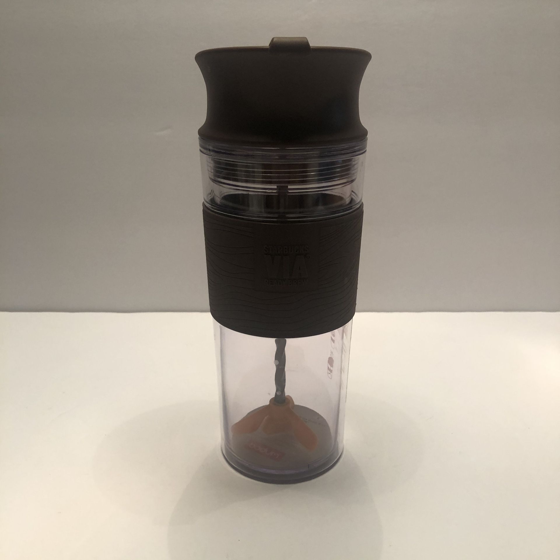 New but has a crack in the bottom but holds water without leaking (I tested it to make sure) Starbucks Via Ready Brew Tumbler with Swirl Mixer and Silicon Sleeve 16 oz Bodum The tumbler features include: Clear plastic with brown silicon sleeve Stainless steel and orange plastic swirl mixer Brown screw-on lid with flip sip top Measures approx. 8.5" tall and 3" across top See photos. Please check out my other listings, happy to bundle
