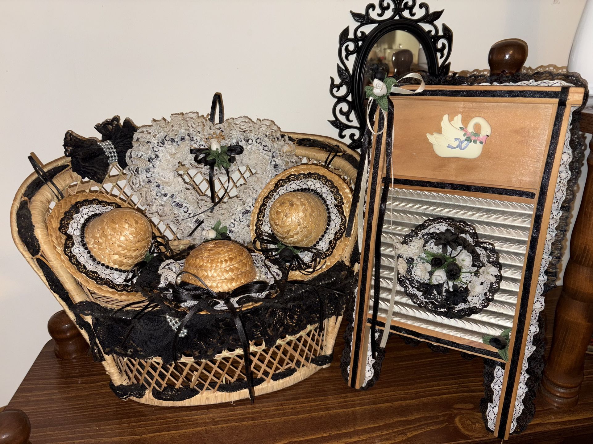 Charming vintage décor bundle perfect for cottage core, farmhouse, or shabby chic styling. Set includes: ✔️Woven wicker chair decorated with black lace, ribbon, mini straw hats, and floral accents V Heart-shaped lace wreath with lace and ribbon detailing ✔️Decorative wooden washboard with lace trim, floral center, and a painted swan All pieces are in great condition and beautifully coordinated. Message me if interested!📩