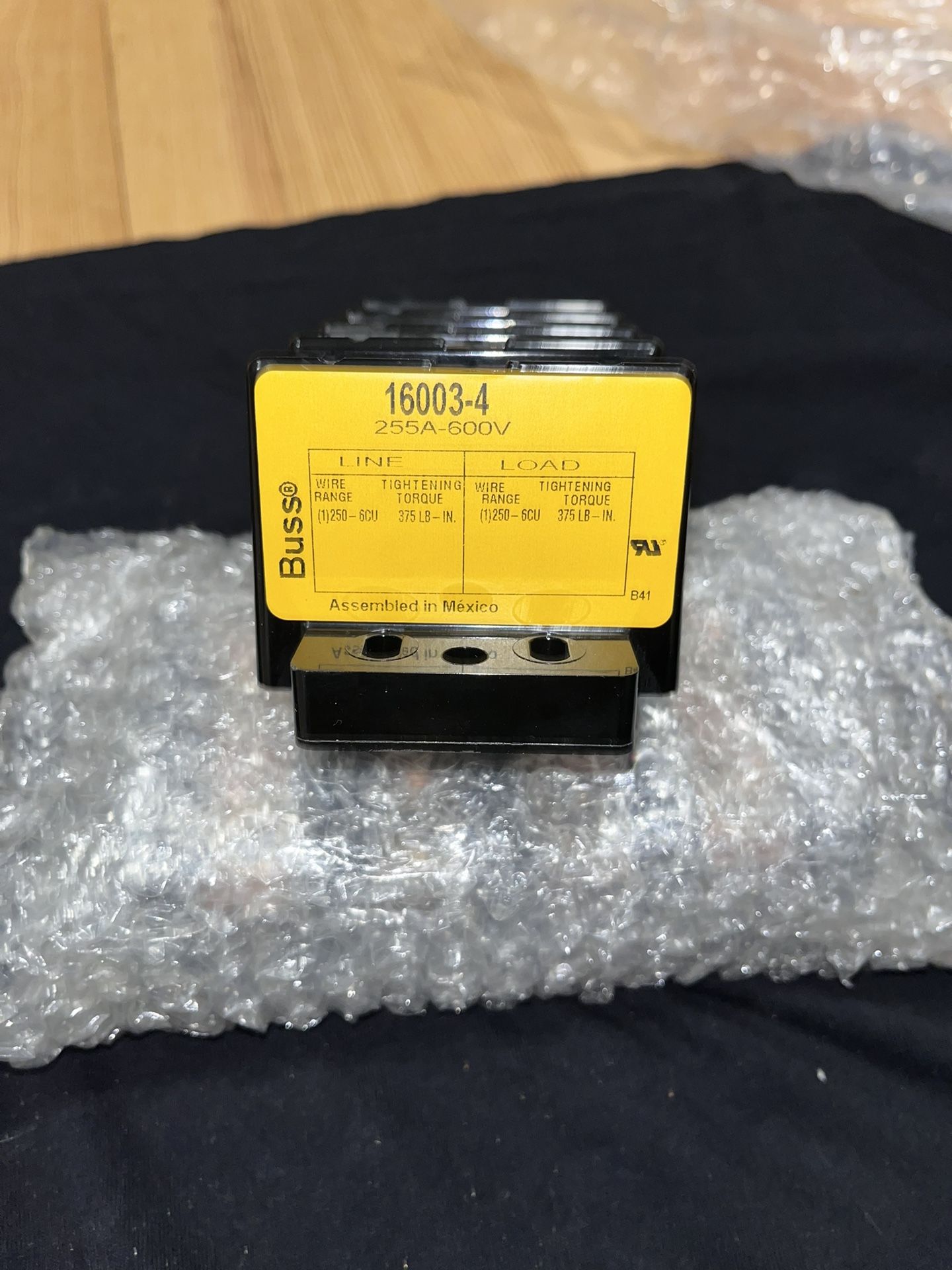 Power Distribution Block, For Conductor Material Aluminum, Copper, Line Connections/Pole 1, For Line Copper Wire Size - Minimum 6 AWG, For Line Copper Wire Size - Maximum 250 kcmil, Load Connections/Pole 1, For Load Copper Wire Size - Minimum 6 AWG, For Load Copper Wire Size - Maximum 250 kcmil, Maximum Current - Copper Conductor 255 A, Maximum Voltage 600 V AC/DC, Number of Poles 4, Overall Depth 2.6 in, Overall Length 2.66 in, Overall Width 6.13 in, UL 94 Flammability Rating V-0