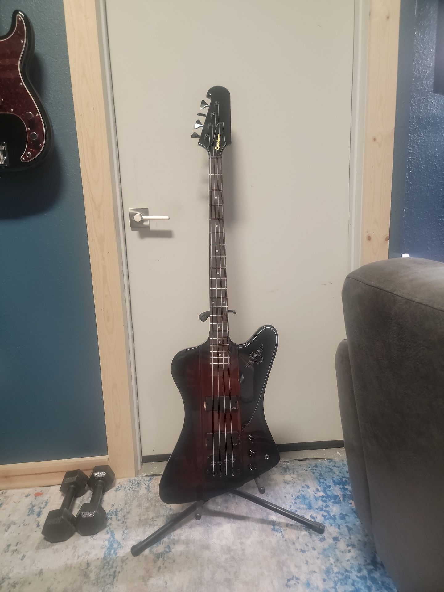 Epiphone Thunderbird Nicely upgraded with EMG35 HZ pickups, Hipshot Supertone bridge and light weight open gear tuners, black pick guard (Original white included) Slight blemish on upper horn from relocating strap button. $350.00 Cash Only, not interested in trades.