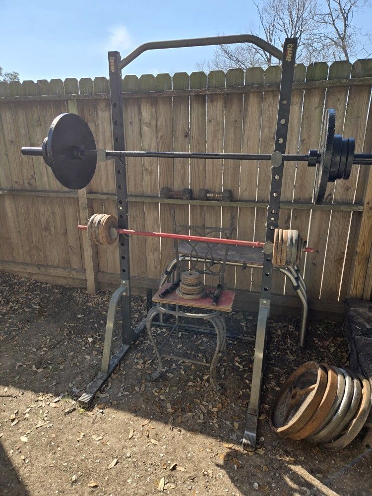 Selling some steel weights with a power rack. The barbell weights 55lbs Eight 45s solid steel weights