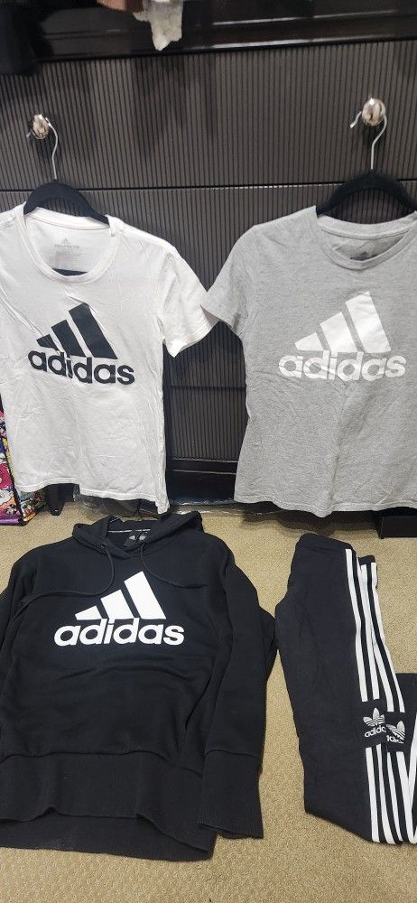 4 pieces of Adidas - 3 tops + 1 pant All are womens size XS (X-Small) All 4 pieces for $20 - 2 tshirt tops (white/black & grey/white) - Black hoodie sweatshirt w/pockets - Black cotton leggings w/white stripes & logo Pickup near Sharp Memorial/Mary Birch Hospitals.