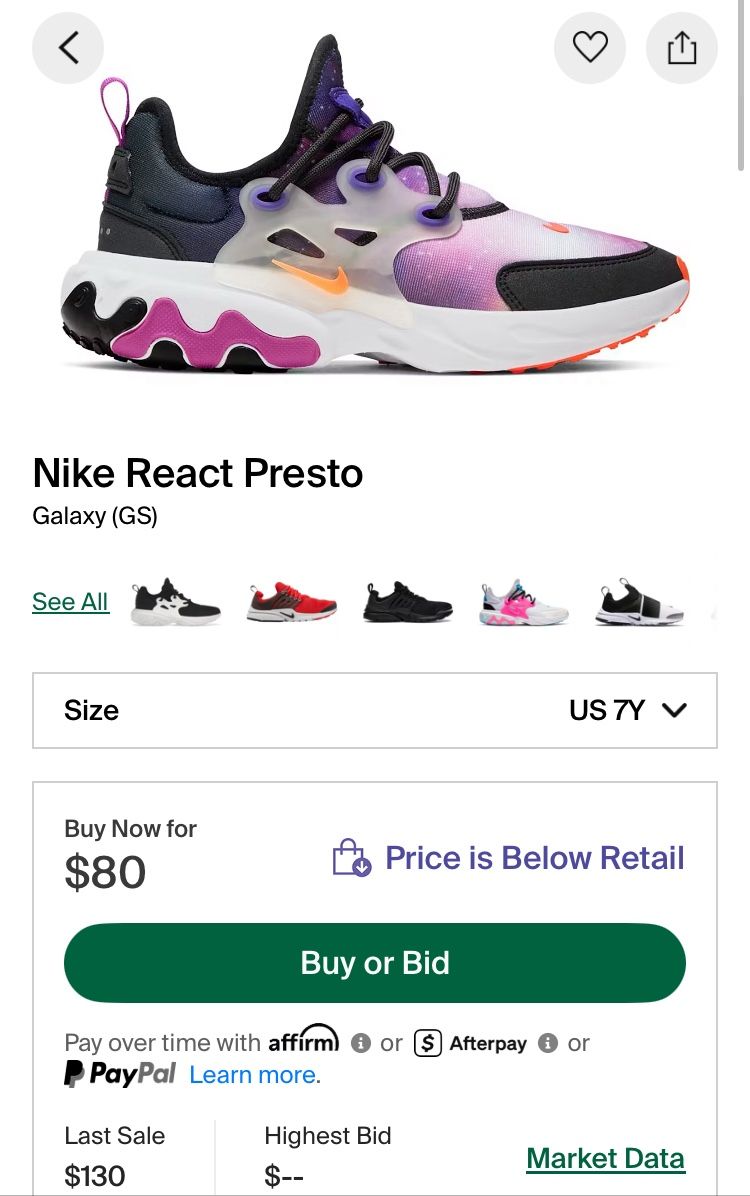 đŞđNike React Presto Galaxy (GS)đđŞ â˘All Prices Negotiable OBO â˘AUTHENTIC (Proof Provided Upon Request) â˘Delivery & Shipping Available (Price Varies on Location) â˘Brand/Style: Nike React Presto â˘SKU: C6624-002 â˘Color: Black/Court Purple-Blue Fury- Total Orange â˘Size: 7Y / 8.5W /7M â˘Box Condition: OG Box Missing Lid (5/10) â˘Shoe Condition: Brand New w/tags (10/10) â˘Trades Welcome in my Favor â˘Serious Inquiries Only DM For Additional Information/Questions âźď¸LOWBALLS WILL BE IGNOREDâźď¸ So Come Correct & Letâs Work