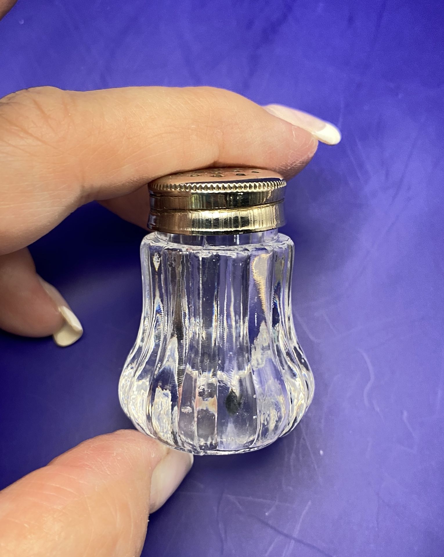 Charming Vintage Shaker. Lucite so Clear it looks like glass with a brass colored metal lid. 1.5”tall