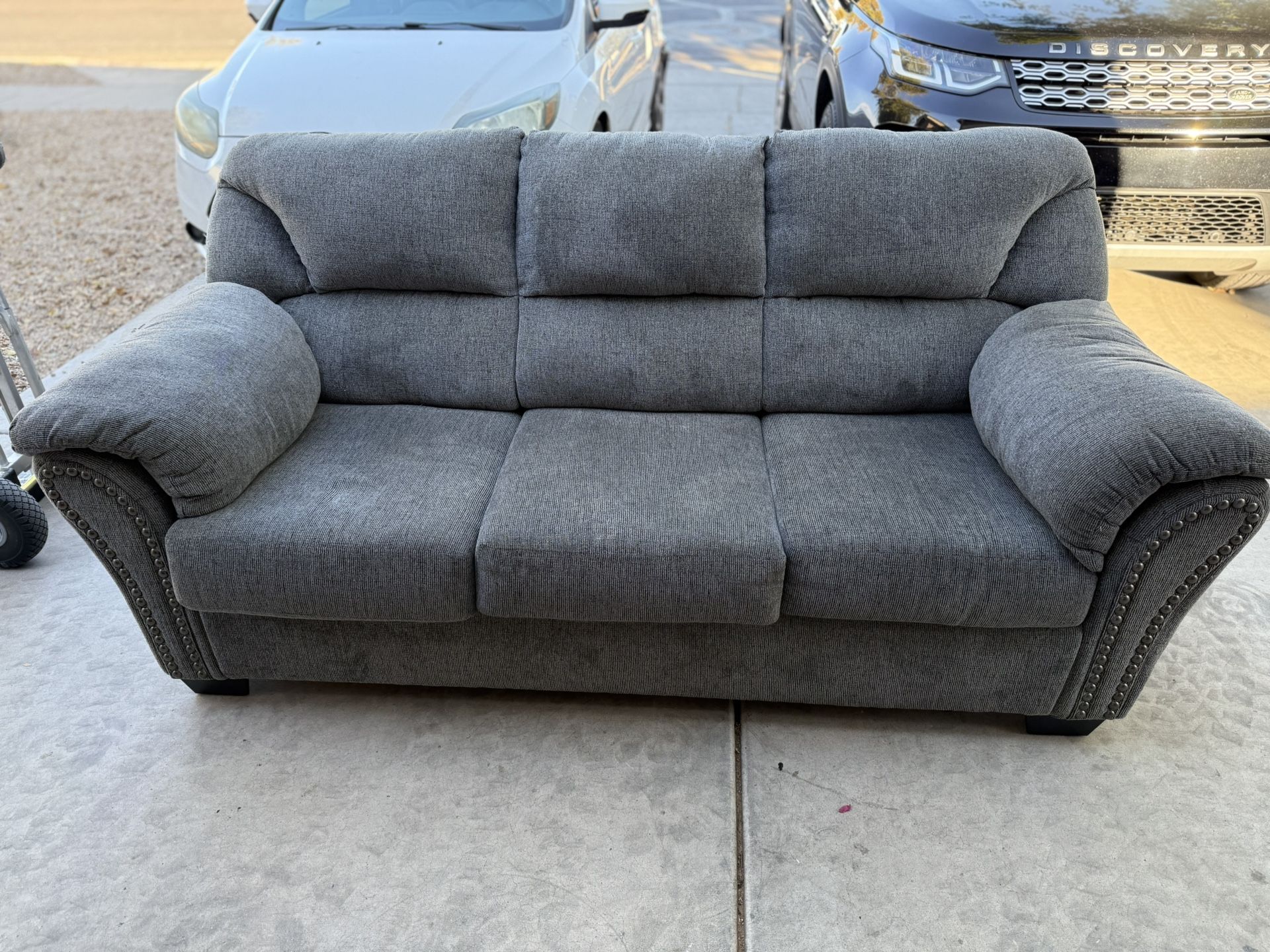 -The sofa is upholstered in soft polyester in a dark gray finish with black nickel-tone nailhead trim on the flared armrest. Dimensions on picture. -Benchcraft by Ashley Allmaxx rocker recliner in pewter polyester upholstery with black nickel nailhead trim. No damage Almost new (1 yr old) Sold together No pets no smoking home Pick up only