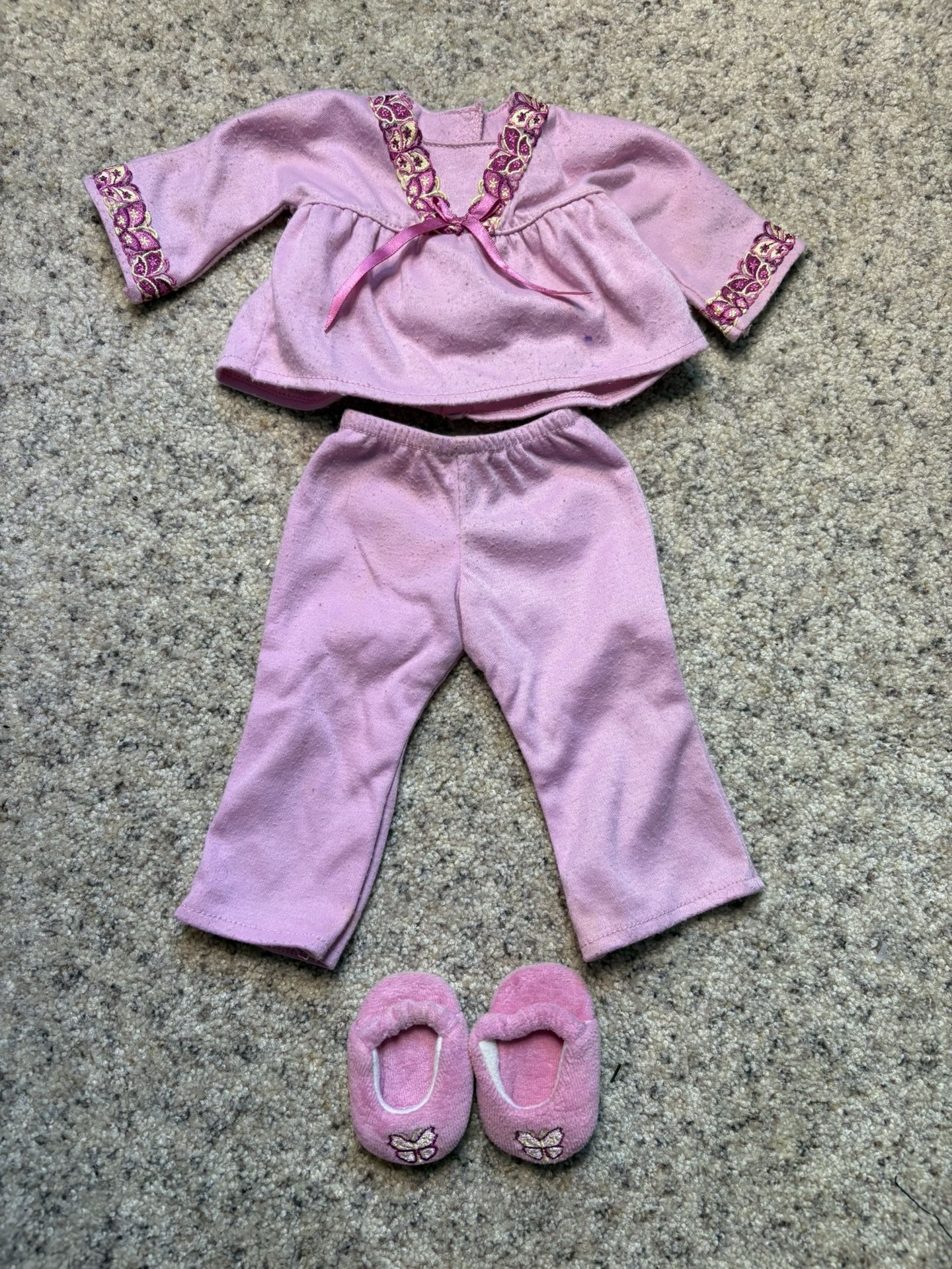 American girl doll clothing item! Julie’s pink butterfly pajamas include: - pajama top - pajama bottoms - slippers Please note condition in pictures.