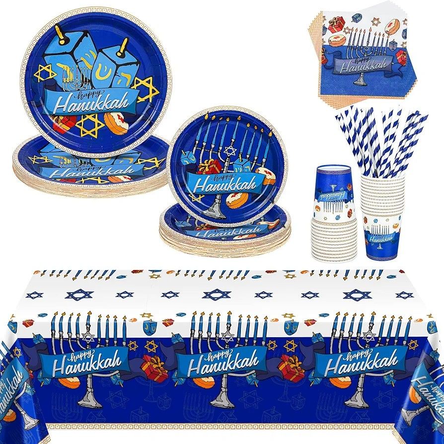 durony 121 Pieces Hanukkah Tableware Set Including Disposable Tablecloth 7 Inch and 9 Inch